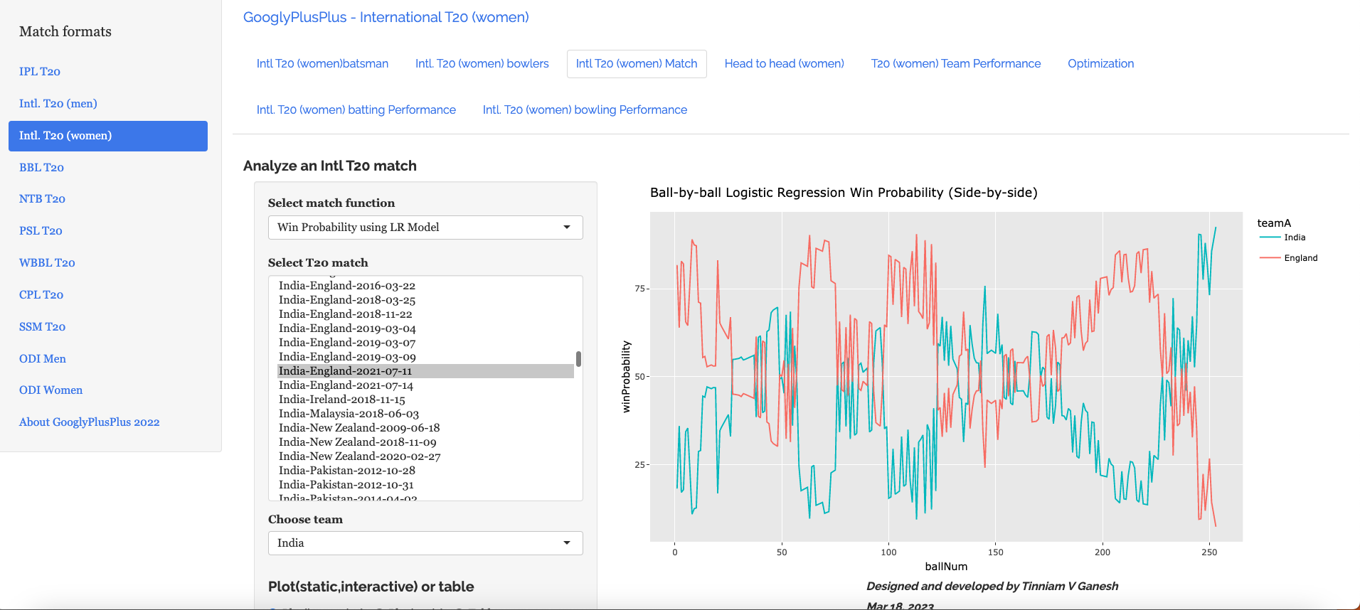 b) Win Probability using the Logistic Regression Model – India vs England Intl. T20 Women (11 July 2021)