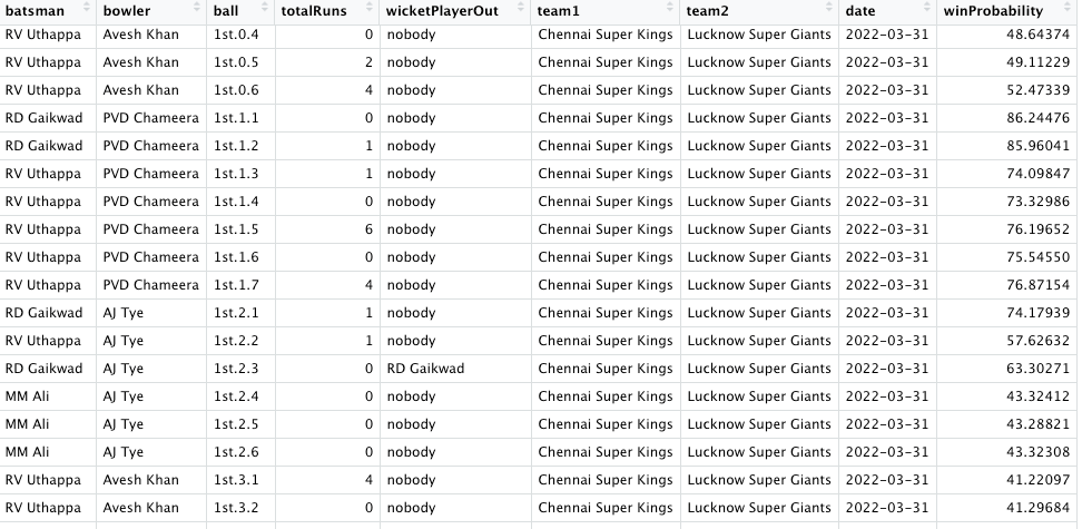 In the picture snippet below, you can see how the win probability changes ball-by-ball for each batsman for a T20 match between CSK vs LSG- 31 Mar 2022