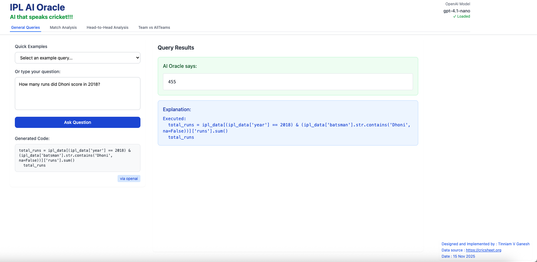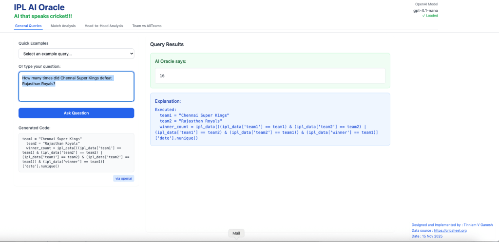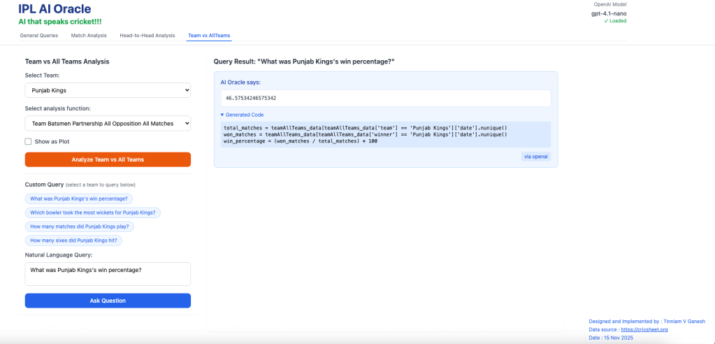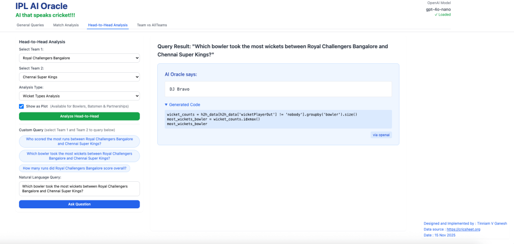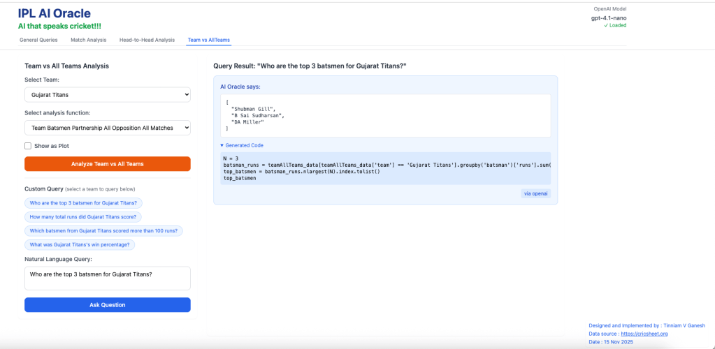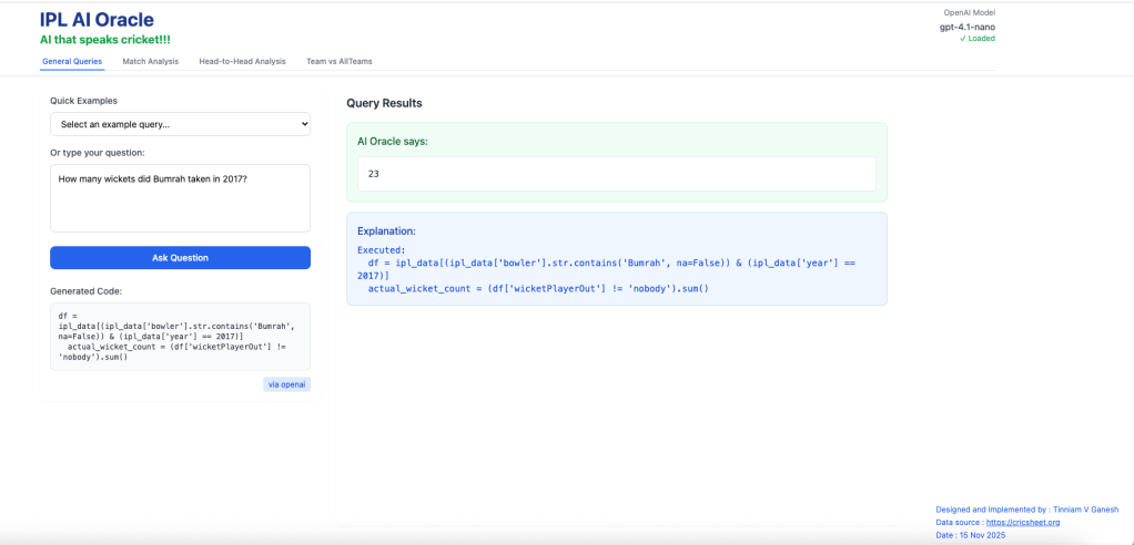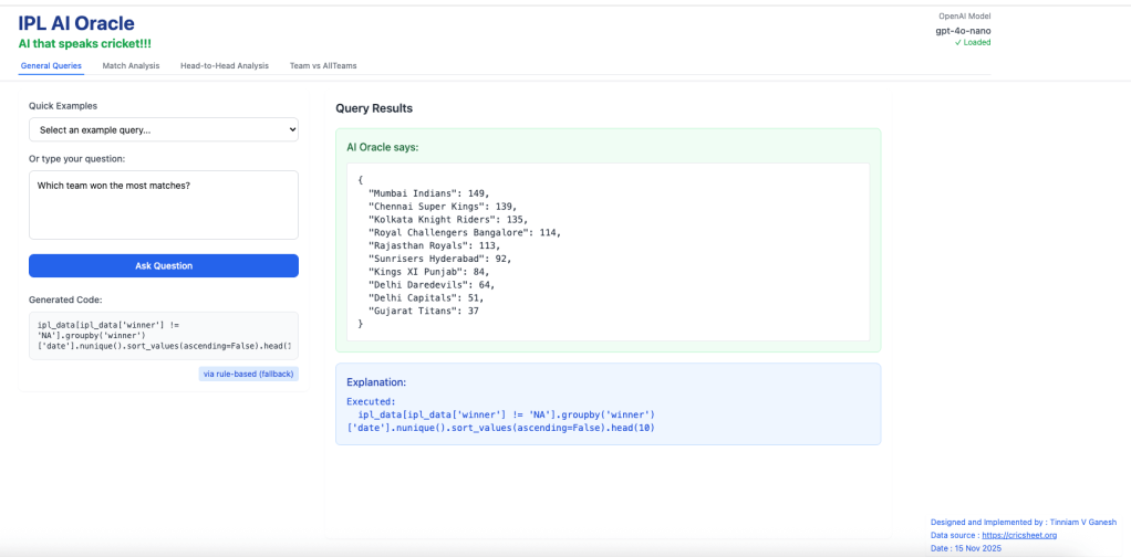 For quite some time I have been wanting to create an application that allows user to query cricket data in plain English (Natural Language Query) and get the appropriate answer. Finally, I have been able to realise this idea with my latest application “IPL AI Oracle:AI that speaks cricket!!!“. While I have just done this for IPL, it can be done for any of the other T20 leagues namely (Intl. T20 Men’s and Women’s, BBL, PSL, NTB, CPL, WBBL etc.). The current app “IPL AI Oracle” is in Python, and is a distant cousin of my Shiny app GooglyPlusPlus written entirely in R (see