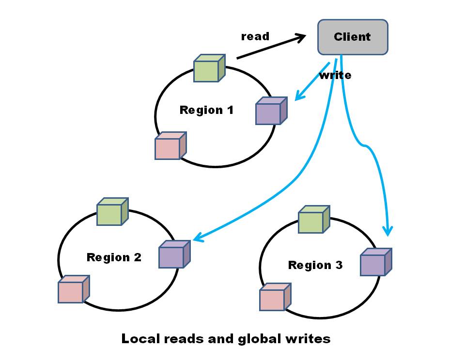 In this technique, updates are done both on local servers along with asynchronous writes to all data centers. The writes are hence global in nature. The updates will not wait for all writes to complete before moving along. However reads will be local ensuring that the latency is low. Data reads based on data proximity will ensure that latency is really low.