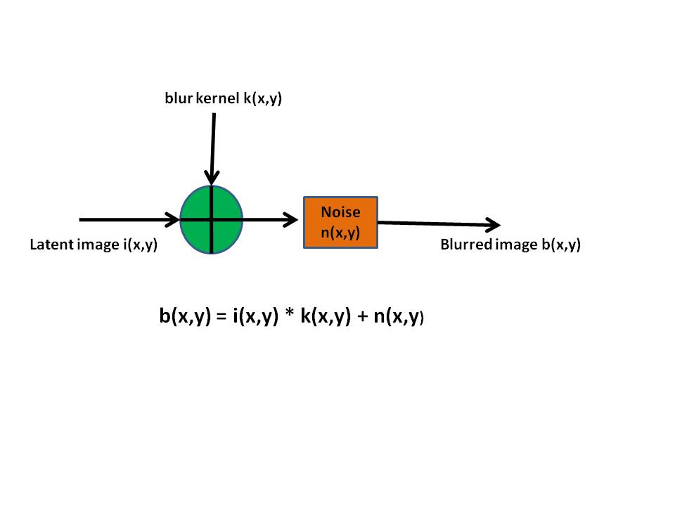 where b(x,y) is the blurred image, i(x,y) is the latent image, k(x,y) is the blur kernel and n(x,y) is random noise.