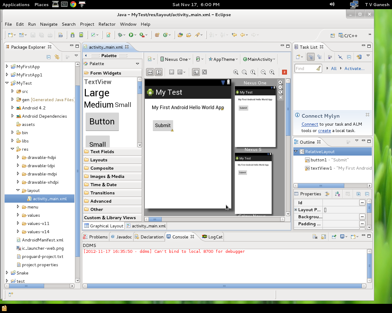 For the 1st Android app under res/layout open activity_main.xml. There are 2 tabs in the eclipse Window namely Graphical Layout and activity_main.xml. The Palette can be used to drag and drop widgets like textfield, buttons, radio buttons etc. For my example I placed a text field with a text “My first Android Hello World App”. You can modify the text after dragging from the palette by right clicking and entering the text string. Similarly I also dragged and dropped a button and named it “Submit”. Right click the button choose Other properties->Inherited from View and select onClick and enter “print” for New OnClickValue. Now the function print will be invoked when the Submit button is clicked.