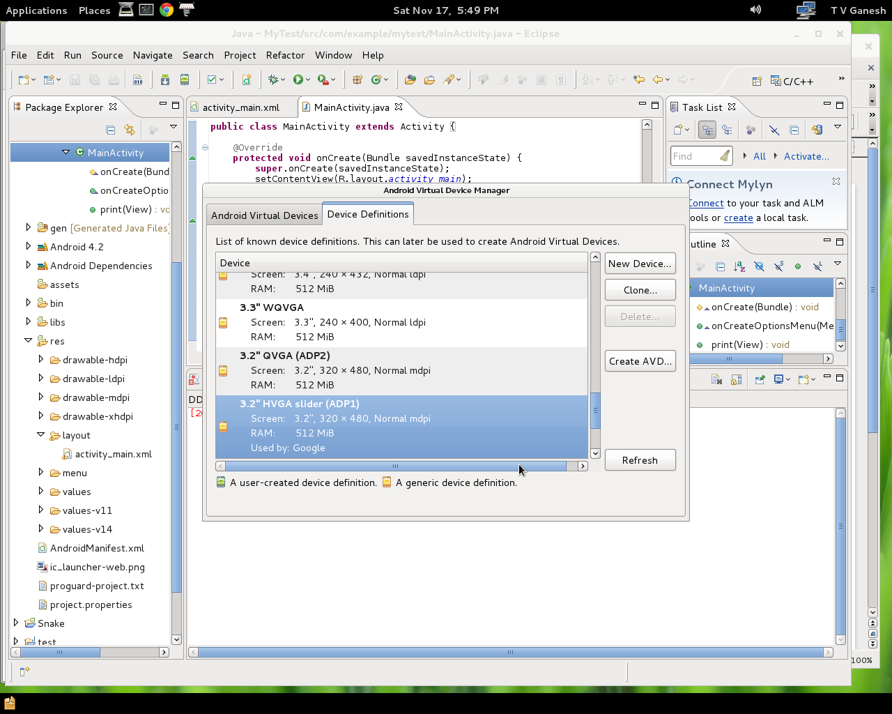 Before you build your application click Windows->Android SDK Manager. Select Tools, Android 4.2 and the necessary Extras. This will update your SDK with the latest version of teh SDK and associated libraries. Now click Windows-> Android Virtual Device Manager. This is Android’s emulator and needs to be setup. The simplest way is to select the Device Definitions tab and choose one of the devices mentioned there as your AVD. Alternatively you can select New and create a custom AVD.