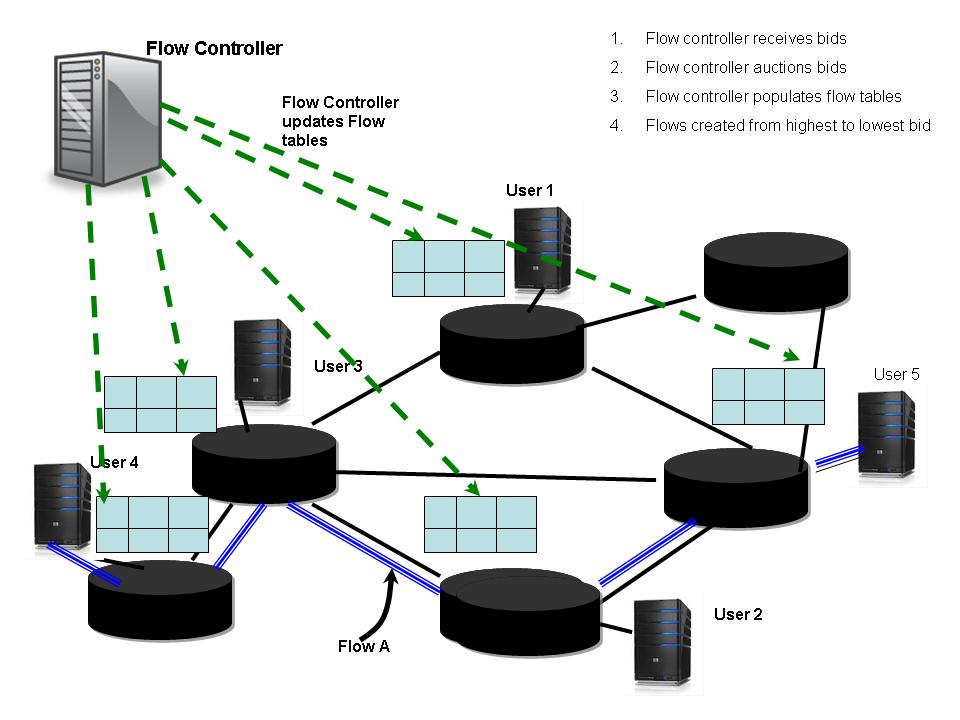 The OpenFlow protocol has a Flow Controller element which can be made to create different flows by manipulating the flow tables of the different network elements. Hence the Flow Controller depending on the bid price, the bandwidth rate and the QoS will auction the different bids and create different flows for different users. The Flow Controller will then update the flow tables of the network elements that will participate to realize this end-to-end flow of traffic for different users.