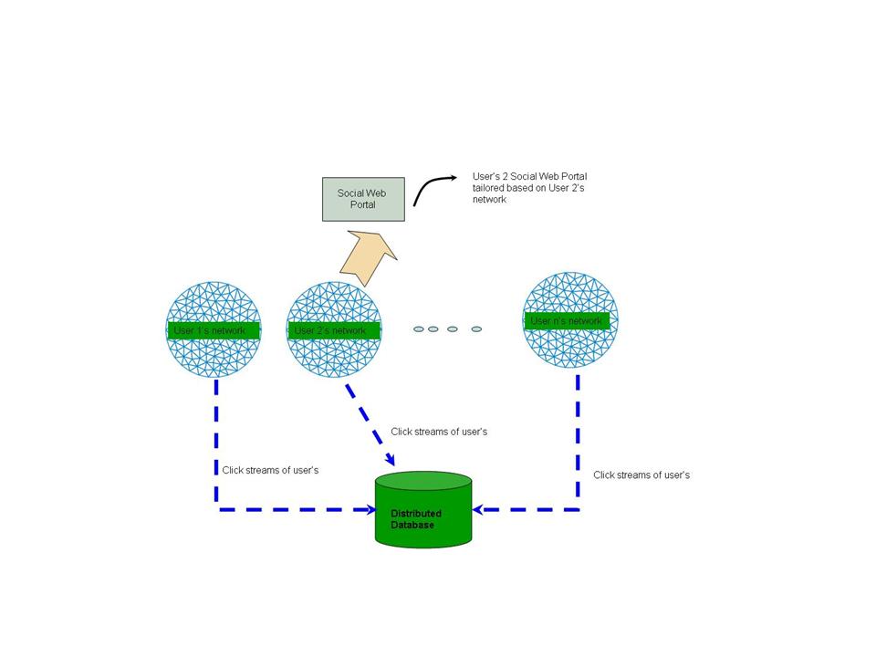 In the above figure the click streams of the network of all the users of the Social Web Portal are collected in the distributed database. When a user logs into his Social Web Portal the query will return the overall browsing trends of the user’s family, friends, professional colleagues and the world. Those news items that are popular will be bubbled up to the user along with his or her own preferences. Hence the user will feel connected to his/her network and will have a novel browsing experience.