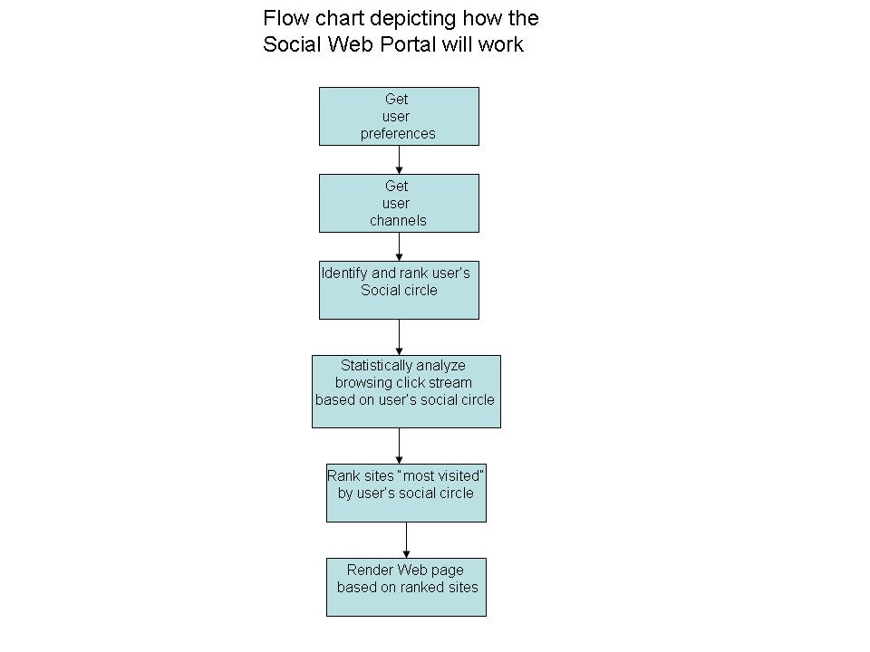 The Social Web Portal is not a personalized home page in which RSS feeds or inputs from feed aggregators or site aggregators are taken. The Social Web Portal is common portal into which all users would log into similar to Facebook, Google+ or Twitter. All users can choose their friends, acquaintances, professional colleagues in this portal. Once users are registered the click stream history of the all the registered users are continuously updated by the Social Web Portal to a back-end database. Then based on each individual’s social circle the Social Web Portal will perform a statistical analysis of those URLs which were more relevant in the user’s social circle and display these URLs in the user’s page on the Social Web Portal. So when the user logs into the Social Web Portal the webpage will be personalized based on the user’s individual preferences and the collective browsing history of the user’s social circle (friends, colleagues,acquaintances etc).