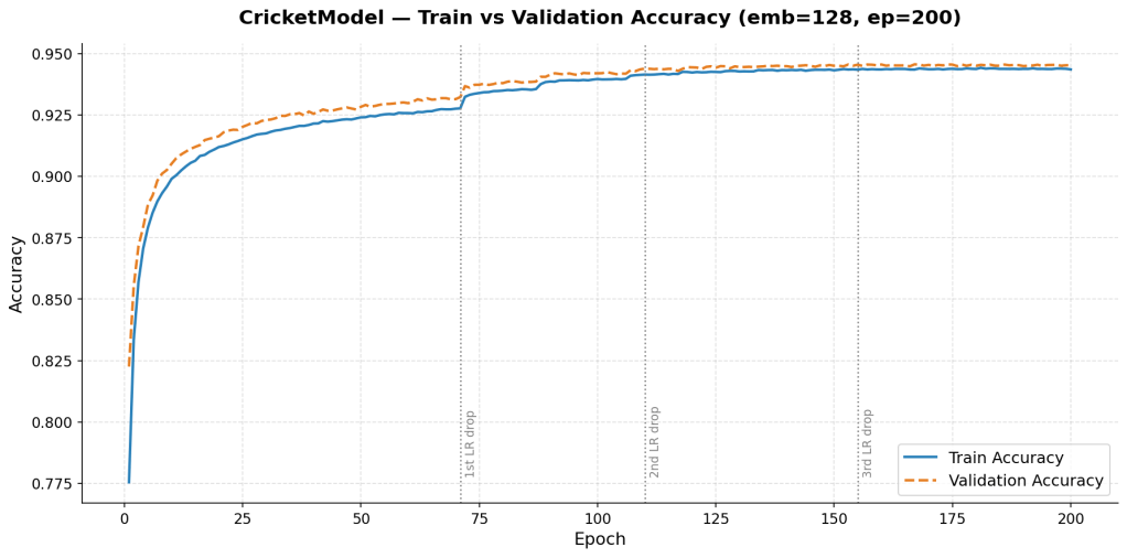 6 epochs: 80 → 100 (emb=128) 0.9419 +0.0050 ❌ REJECT 2nd LR drop just starting at ep95–100 when training ended. Model plateaued at 0.9419.