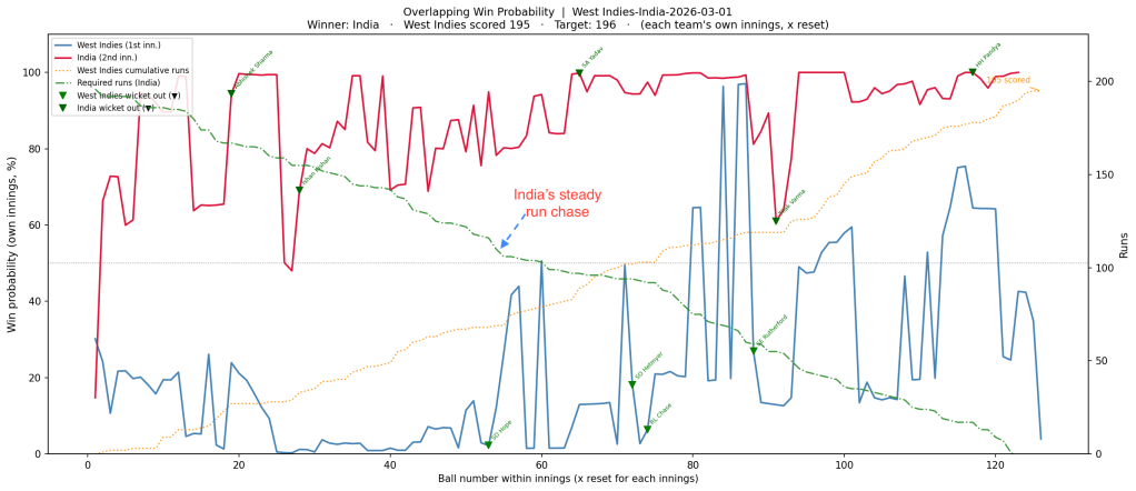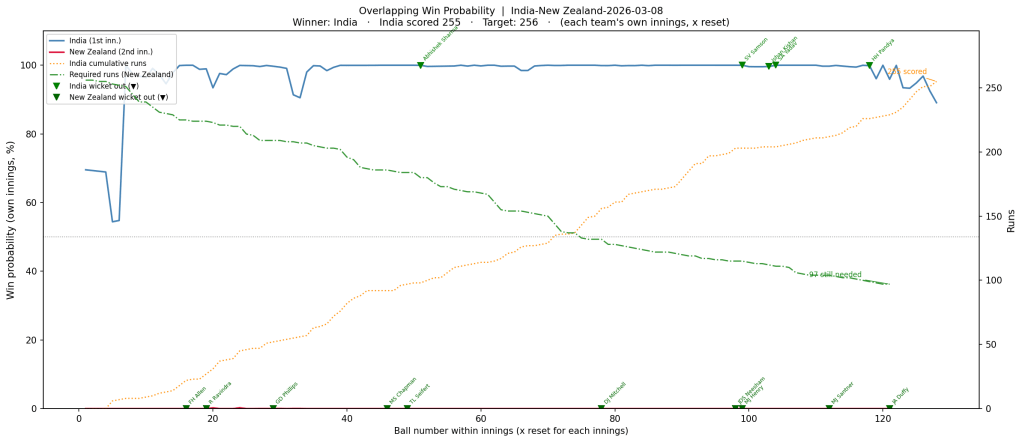 The final trained T20 Win Probability model had a validation accuracy of 0.9452 at which point I stoppd further experiments. This model was downloaded with all the necessary metadata which included the trained weights, the architecture config, and the standard scaler, which needs to be applied on any new data on which the model is actually applied. The trained T20 Win Probability DL Model was applied the three T20 matches in the latest ICC T20 World Cup held this year from Feb 07,206 to Mar 8, 2026.