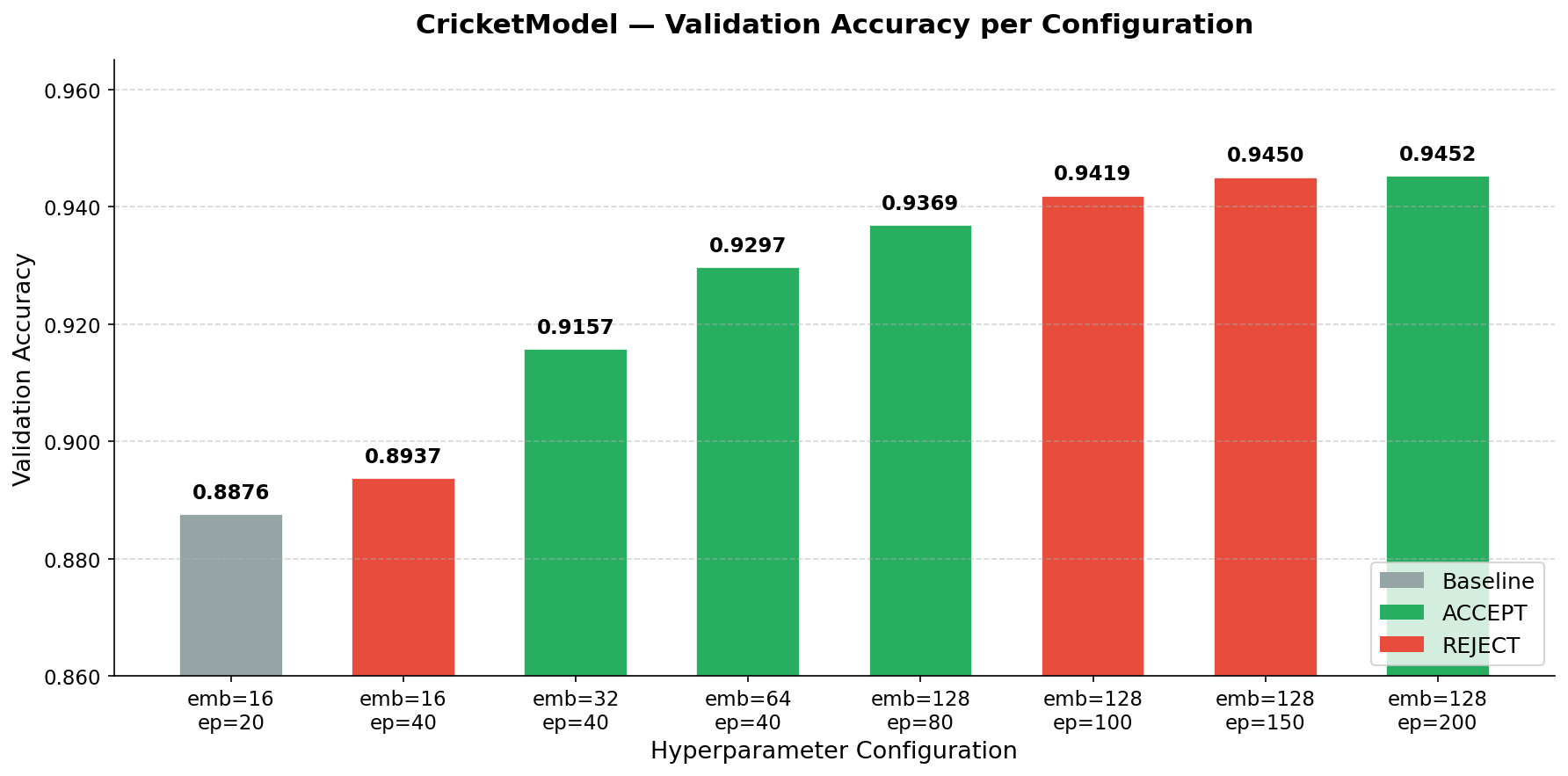 EPOCH, created an initial scaffolding and baseline metrics. It then ran multiple experiments to optimise the validation accuracy which started to inch towards 0.95. Here is a summary of the experiments of EPOCH and the outcomes. EPOCH and Claude Code stored the baseline metrics and results of each experiment in github repo claude_wpa