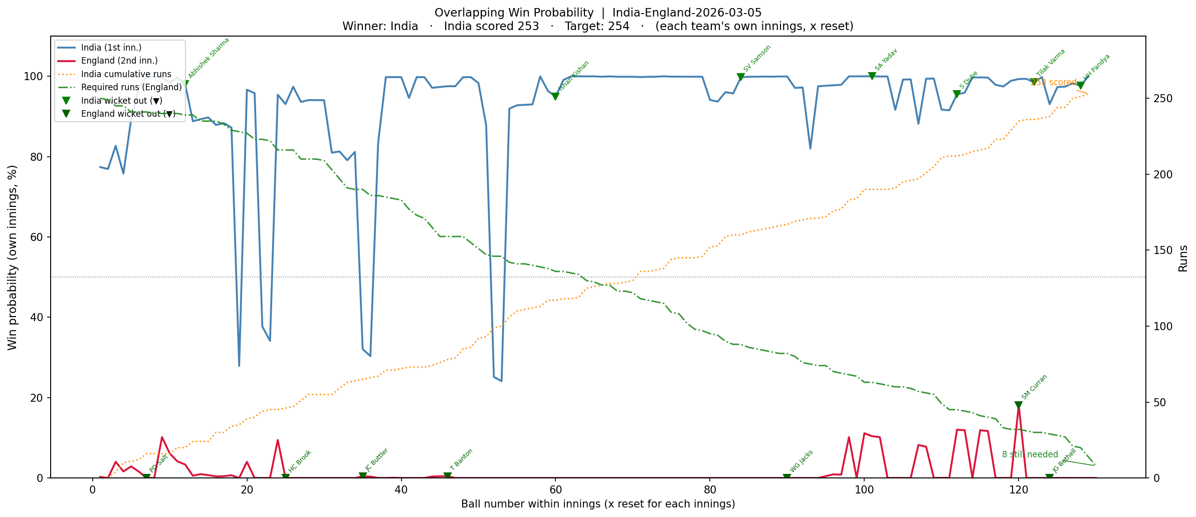 The ball-by-ball Win probability for each team in the T20 match is computed in the charts below. There will be two charts for each of the matches.