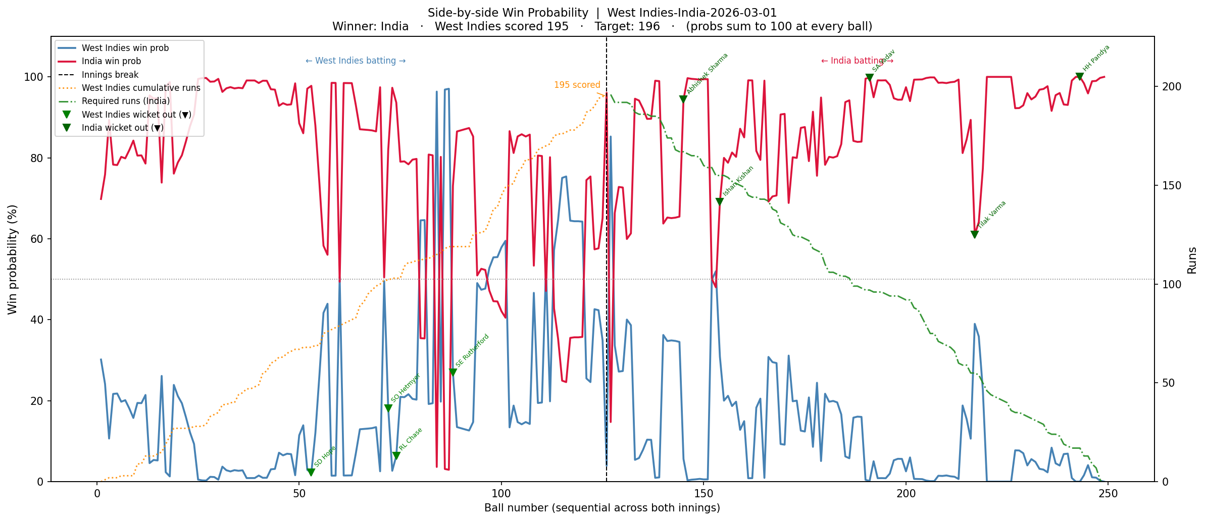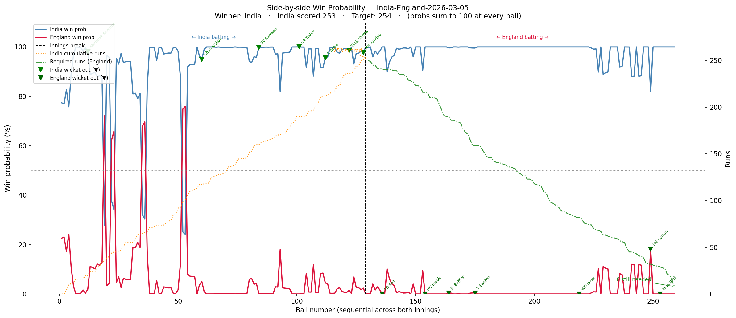 The final trained T20 Win Probability model had a validation accuracy of 0.9452 at which point I stoppd further experiments. This model was downloaded with all the necessary metadata which included the trained weights, the architecture config, and the standard scaler, which needs to be applied on any new data on which the model is actually applied. The trained T20 Win Probability DL Model was applied the three T20 matches in the latest ICC T20 World Cup held this year from Feb 07,206 to Mar 8, 2026.