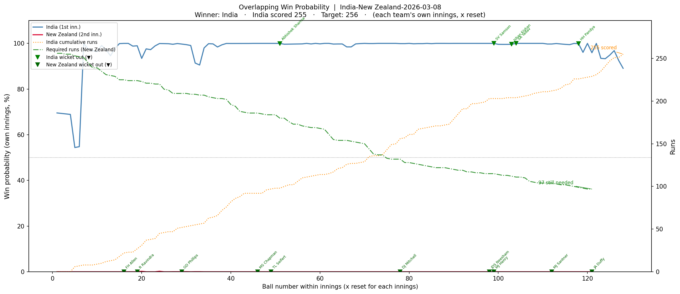 b) Win Probability – Overlapping chart : This chart will be computed using the Deep Learning model for each team independently on a ball-by-ball basis, and then both the probabilities will be super-imposed on one another so that we can see how the probability changed and whether the second team, which had to chase a total, actually was able to do so. If it could, then the win probability would actually exceed the the first team with Win Probability
