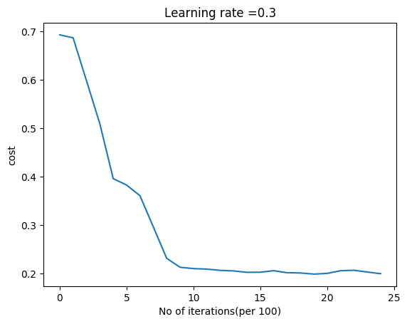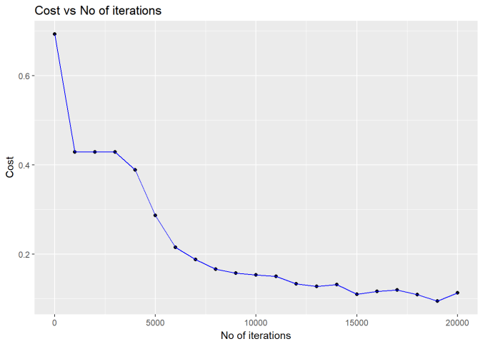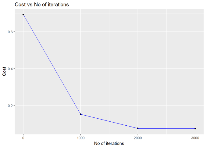 # Plot cost vs iterationcosts<-retvals[['costs']]numIterations=3000iterations<-seq(0,numIterations,by=1000)df<-data.frame(iterations,costs)ggplot(df,aes(x=iterations,y=costs))+geom_point()+geom_line(color="blue")+xlab('No of iterations')+ylab('Cost')+ggtitle("Cost vs No of iterations")