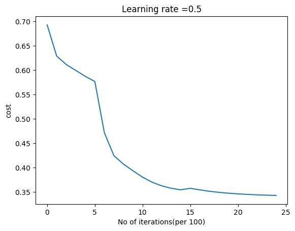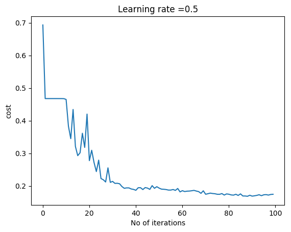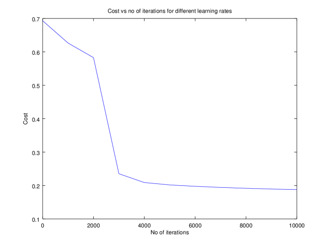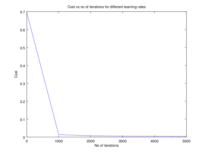 source("mnist.R")load_mnist()#show_digit(train$x[2,]layersDimensions=c(784, 7,7,3,1)# Works at 1500x<-t(train$x)# Choose only 5000 training datax2<-x[,1:5000]y<-train$y# Set labels for all digits that are 'not 5' to 0y[y!=5]<-0# Set labels of digit 5 as 1y[y==5]<-1# Set the datay1<-as.matrix(y)y2<-t(y1)# Choose the 1st 5000 datay3<-y2[,1:5000]#Execute the Deep Learning Modelretvals=L_Layer_DeepModel(x2, y3, layersDimensions,