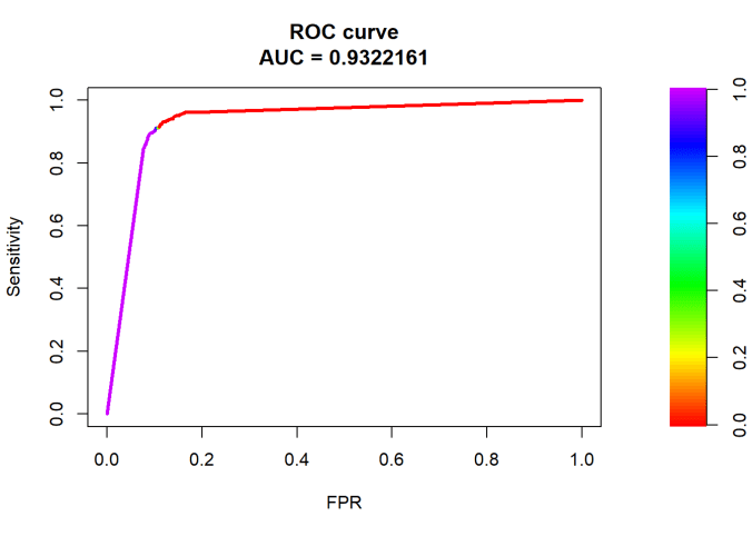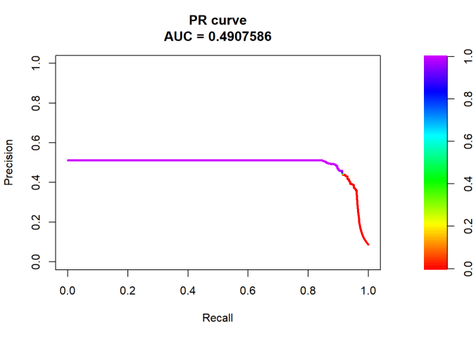 # Compute probability scoresscores<-computeScores(retvals$parameters, x2,hiddenActivationFunc='relu')a=y3==1b=y3==0# Compute probabilities of class 0 and class 1class1=scores[a]class0=scores[b]# Plot ROC curvepr<-pr.curve(scores.class0=class1,