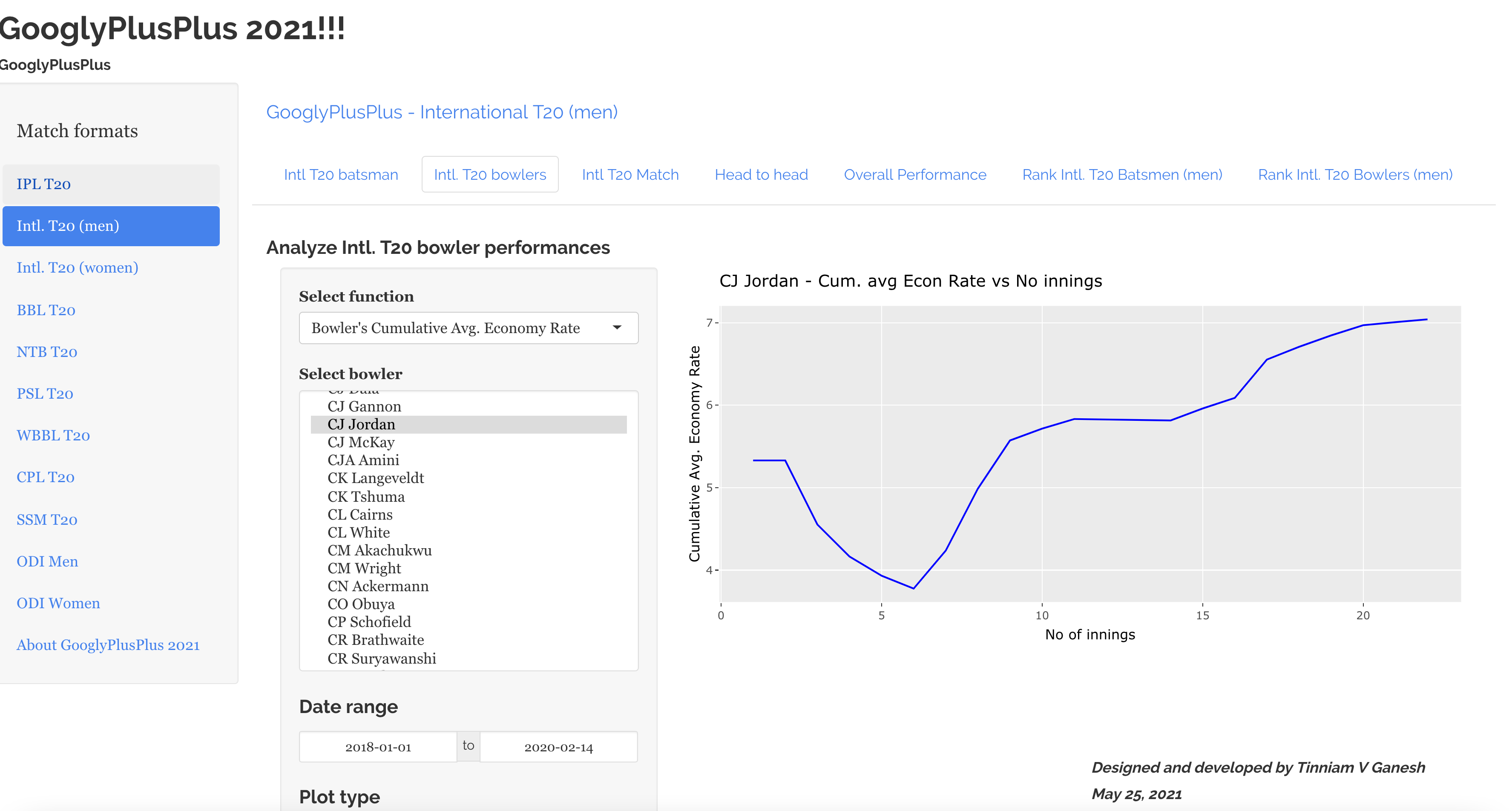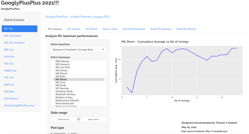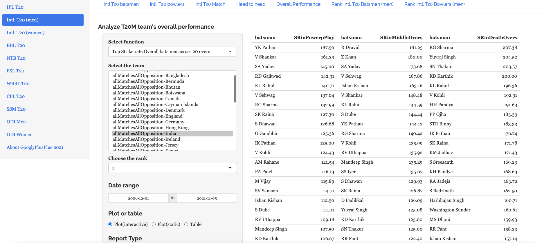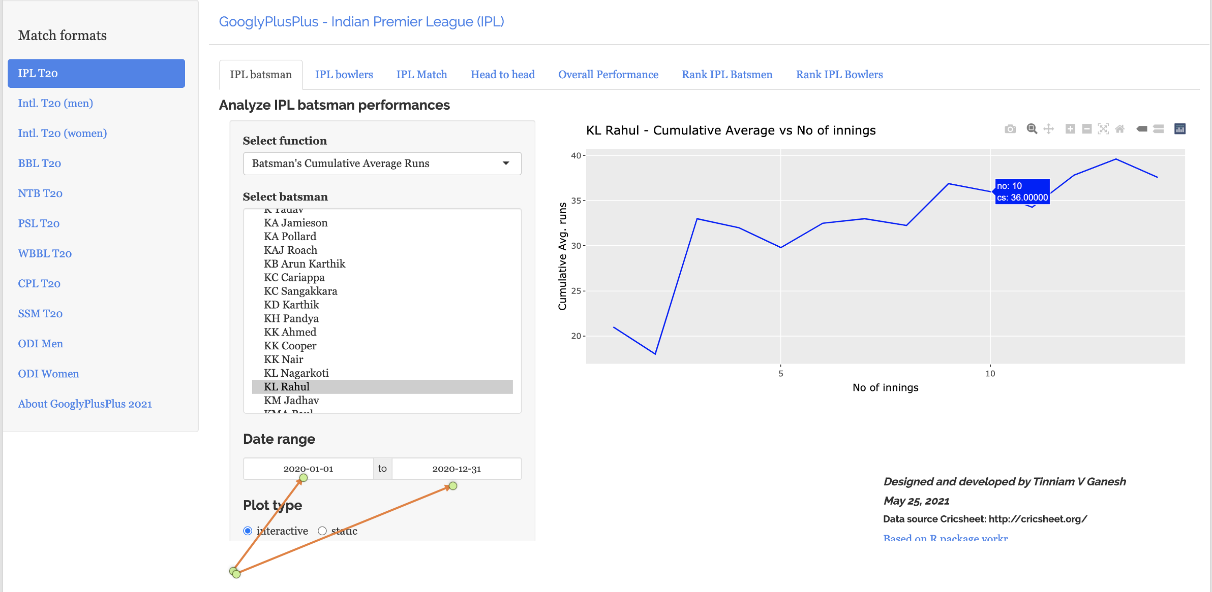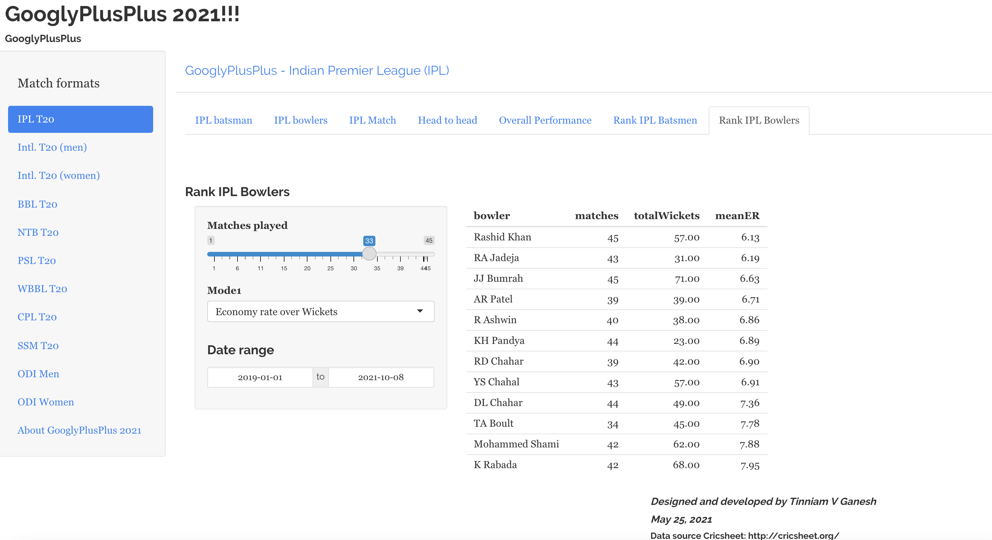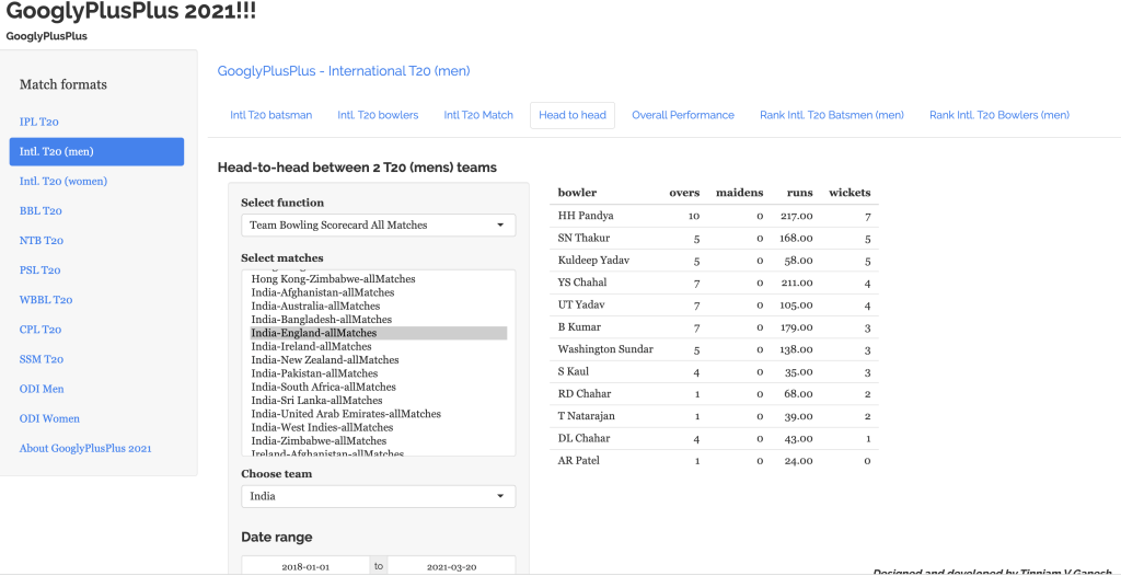 You can now perform drill-down analytics for batsmen, bowlers, head-to-head and overall performance based on date-range selector functionality. The ranking tabs also include date range selector granular analysis. For more details see GooglyPlusPlus2021 enhanced with drill-down batsman, bowler analytics