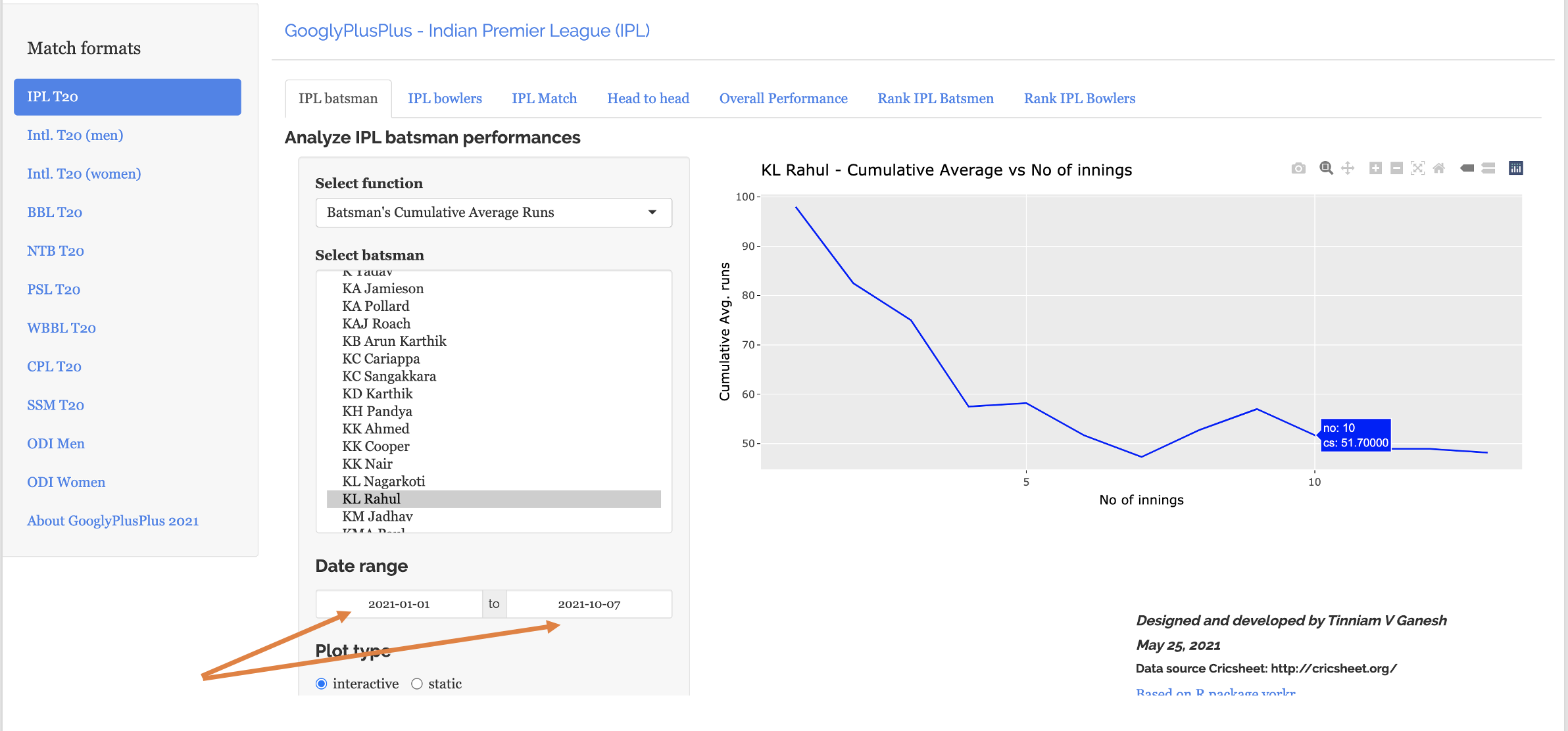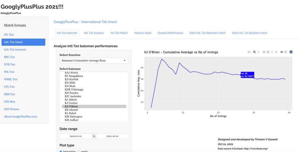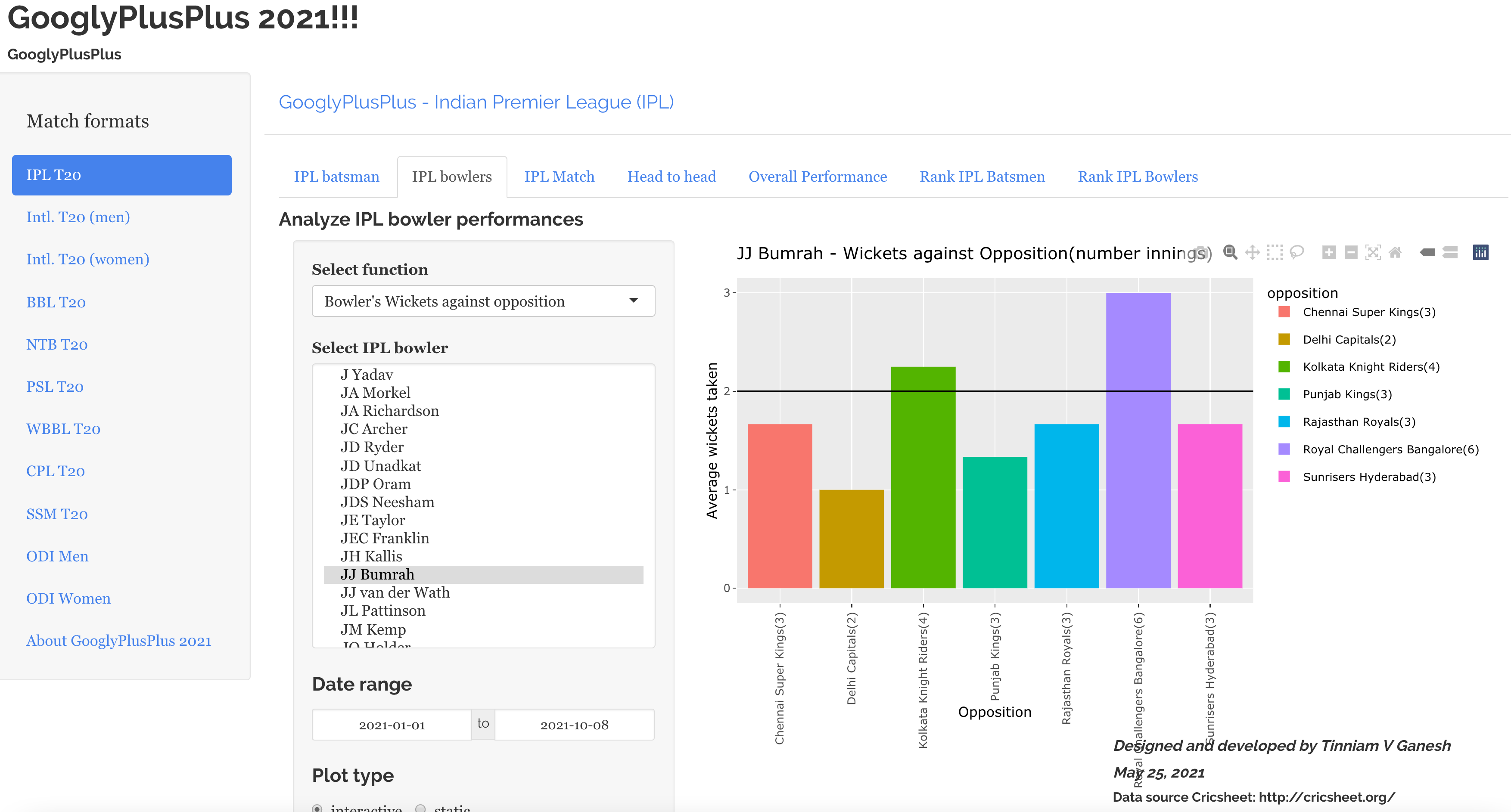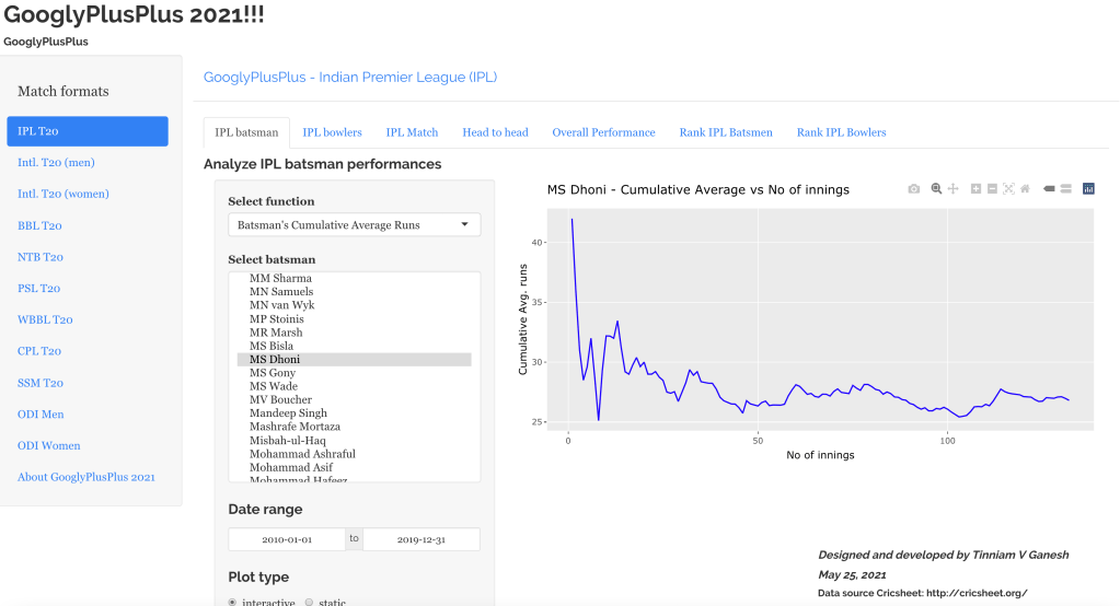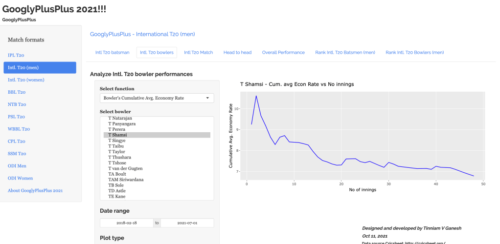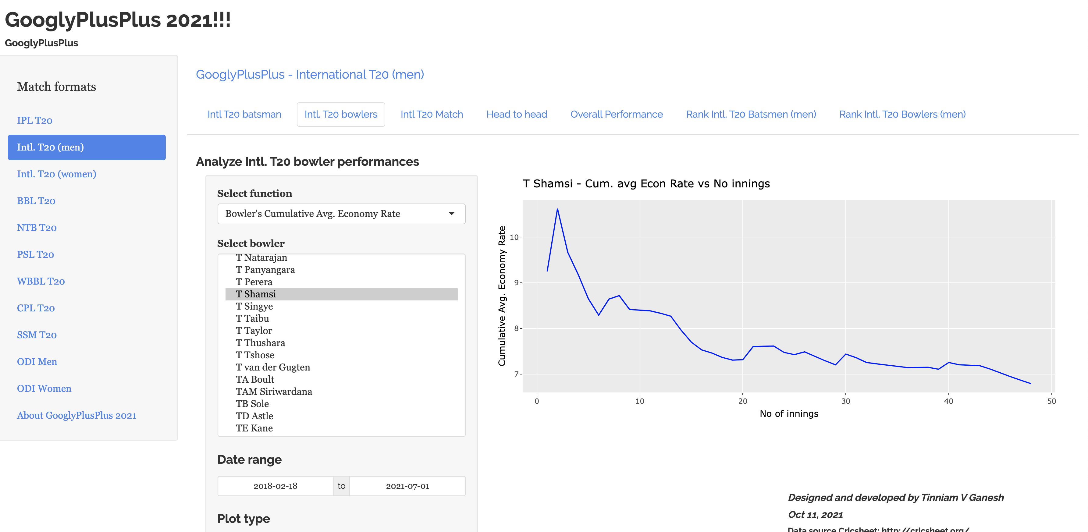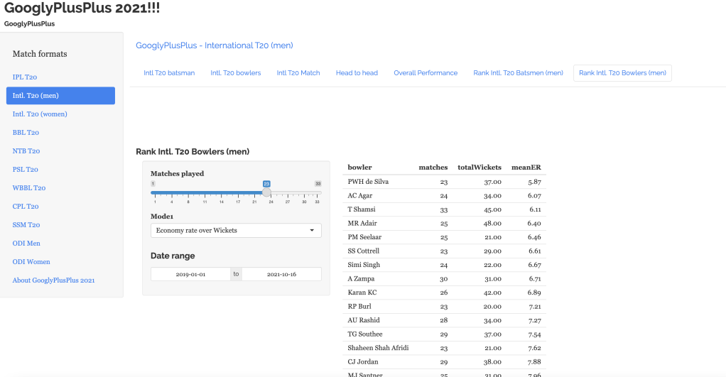 You can now perform drill-down analytics for batsmen, bowlers, head-to-head and overall performance based on date-range selector functionality. The ranking tabs also include date range selector granular analysis. For more details see GooglyPlusPlus2021 enhanced with drill-down batsman, bowler analytics