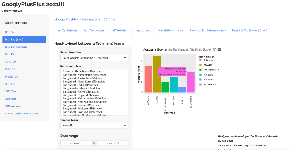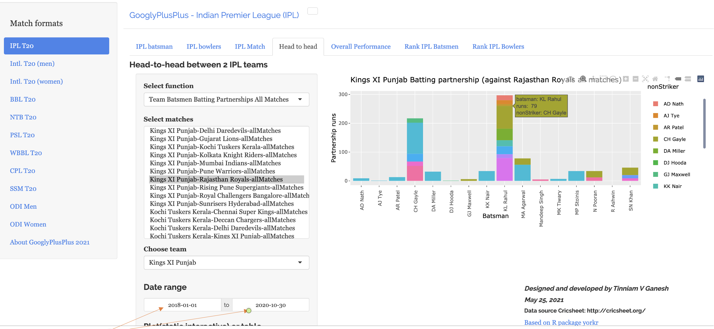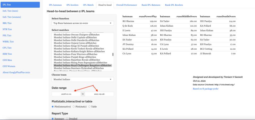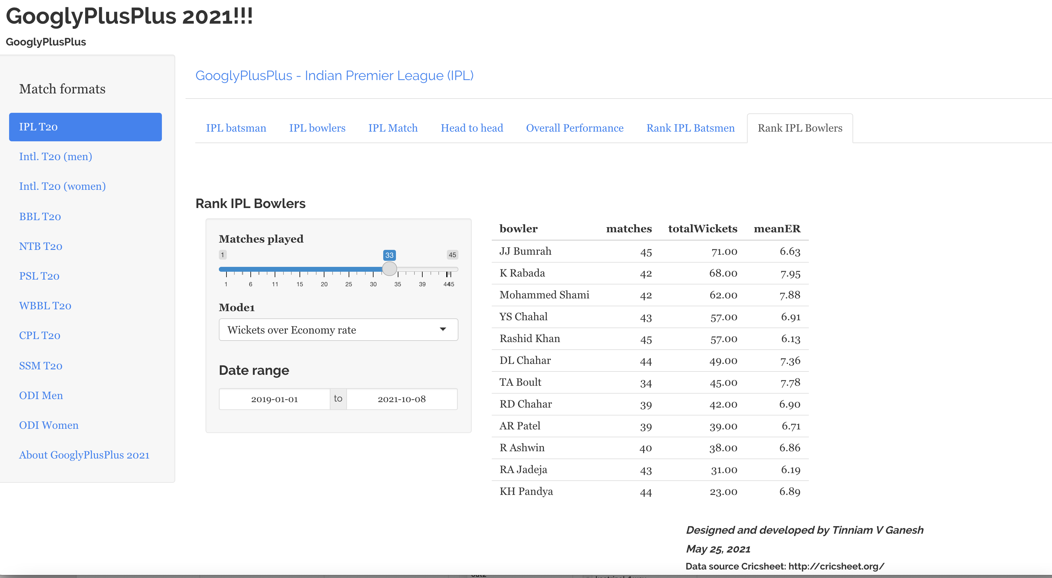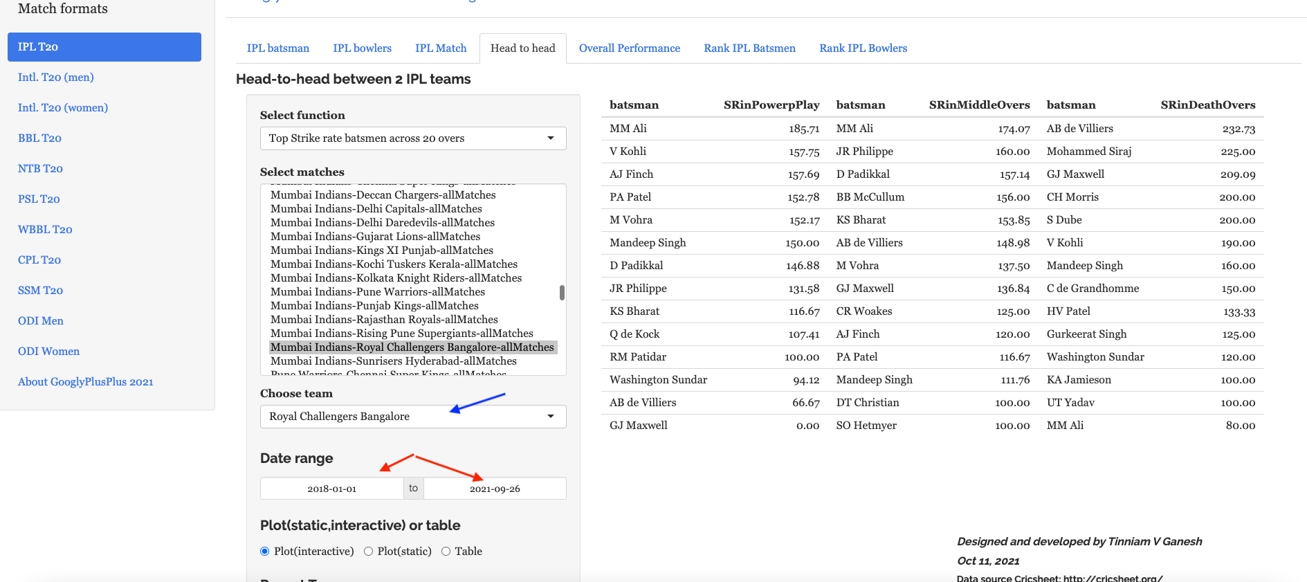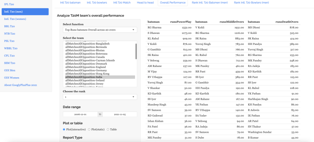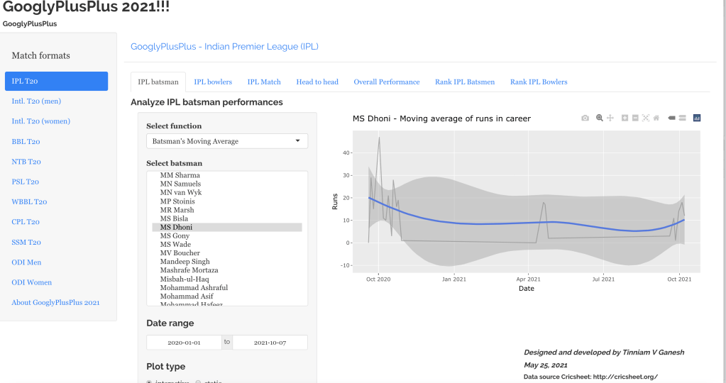 You can now perform drill-down analytics for batsmen, bowlers, head-to-head and overall performance based on date-range selector functionality. The ranking tabs also include date range selector granular analysis. For more details see GooglyPlusPlus2021 enhanced with drill-down batsman, bowler analytics
