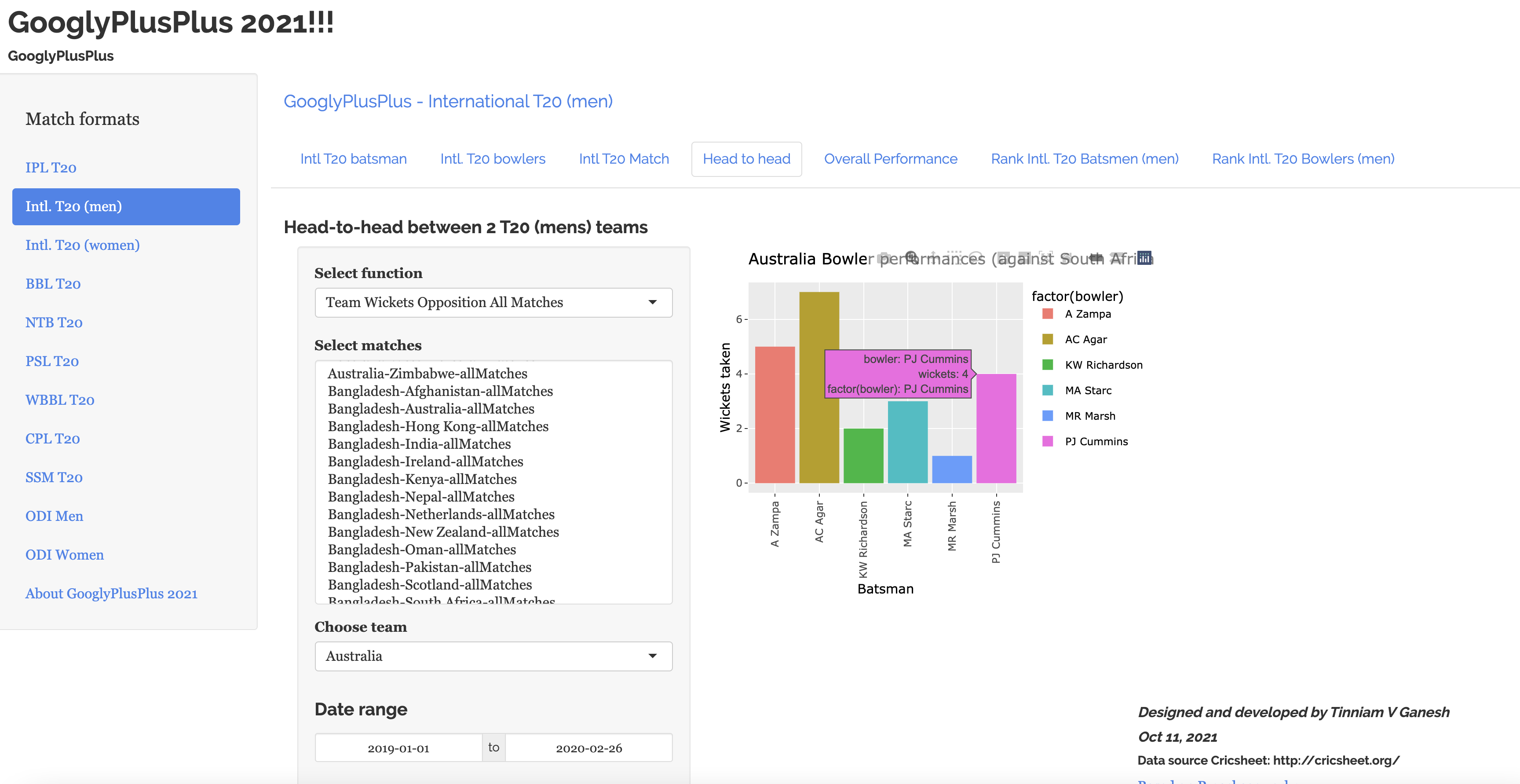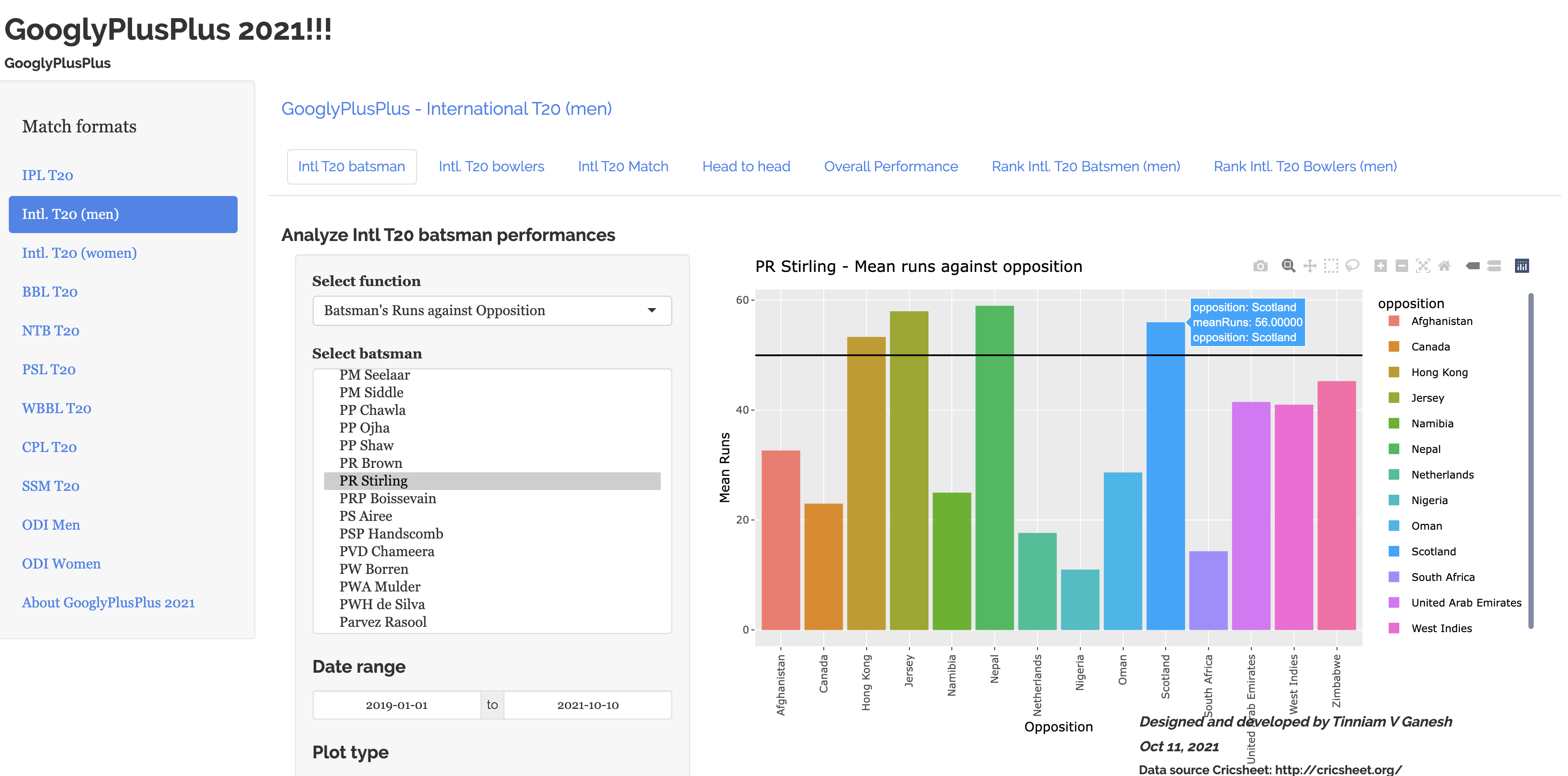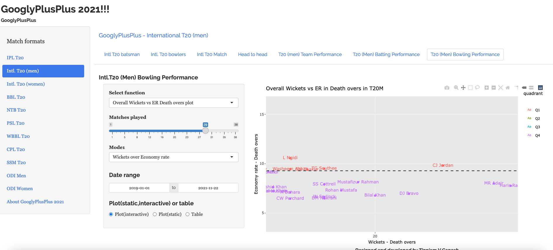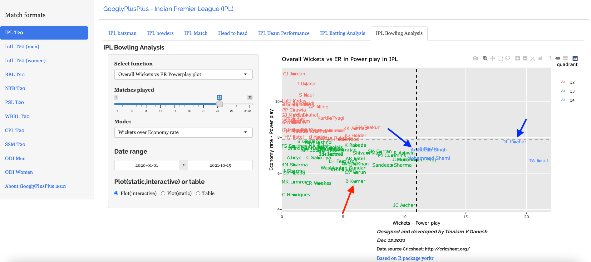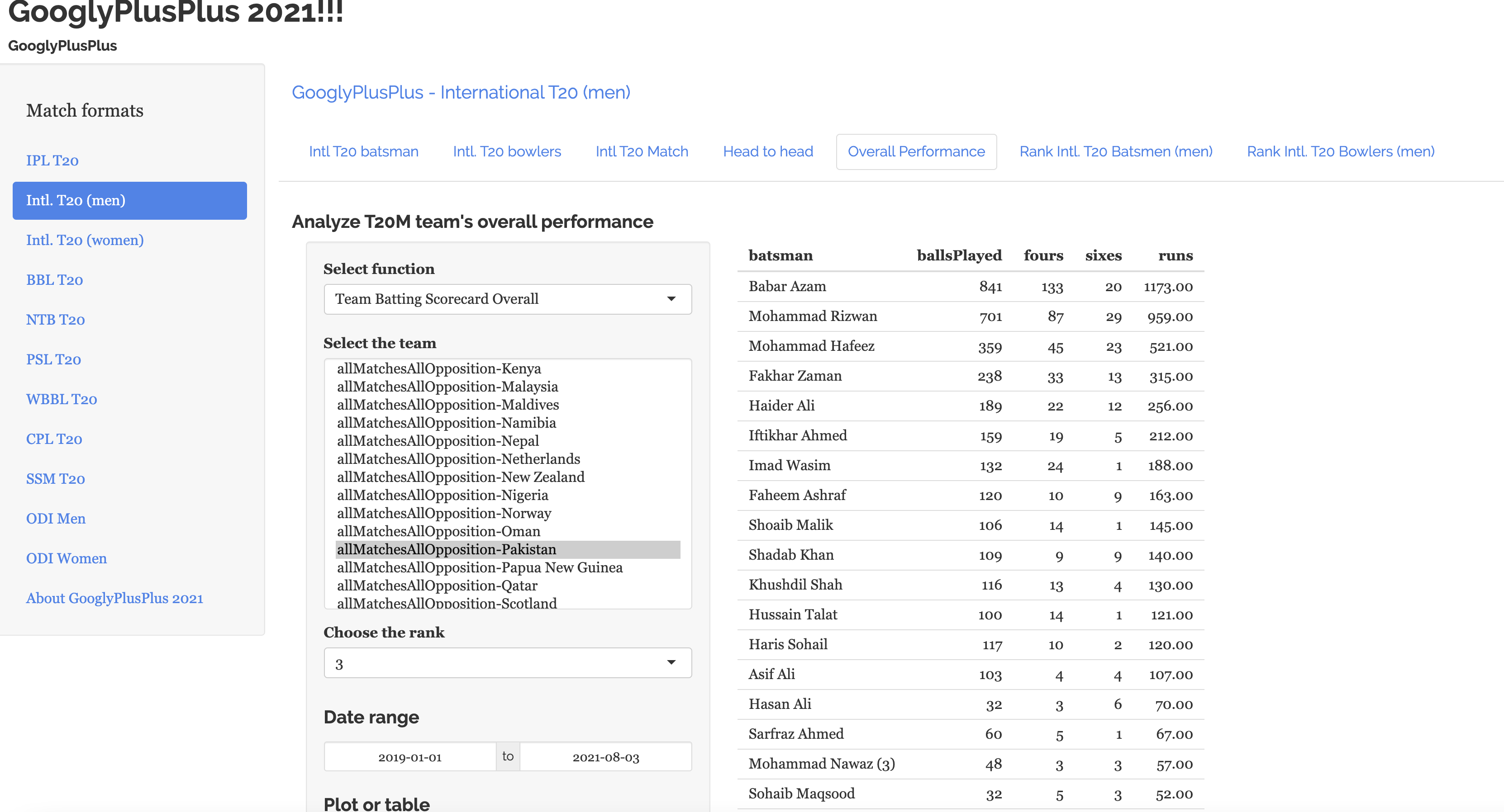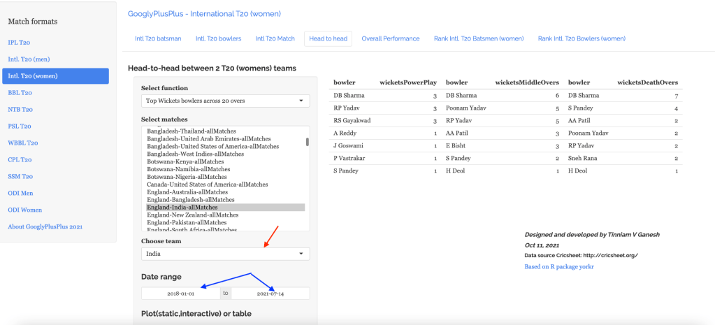 You can now perform drill-down analytics for batsmen, bowlers, head-to-head and overall performance based on date-range selector functionality. The ranking tabs also include date range selector granular analysis. For more details see GooglyPlusPlus2021 enhanced with drill-down batsman, bowler analytics