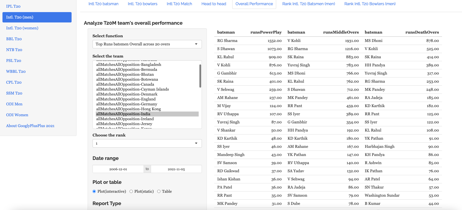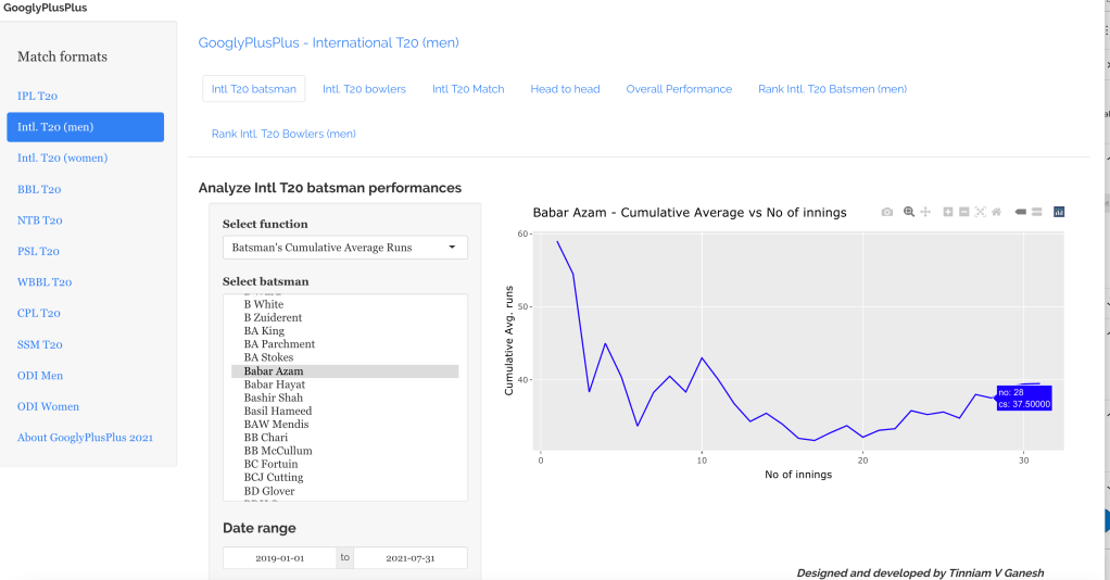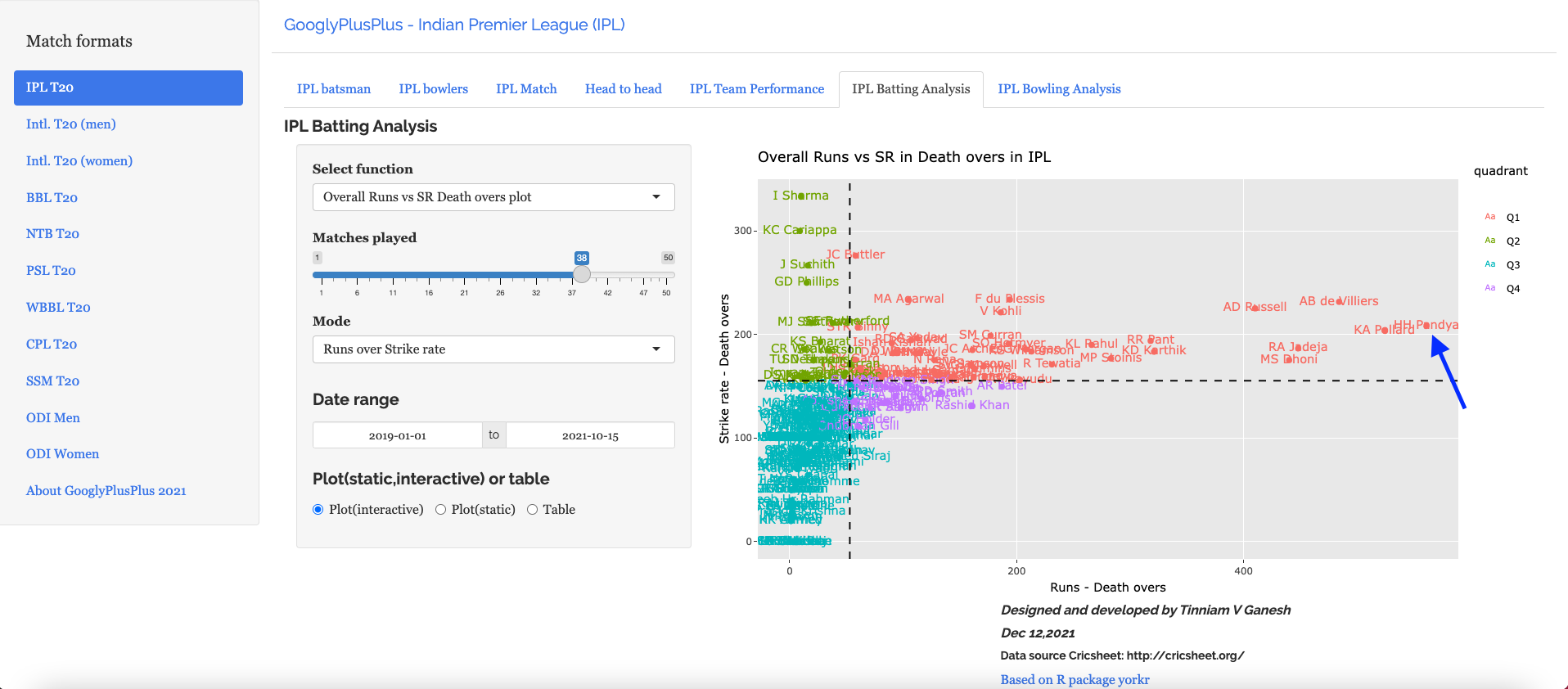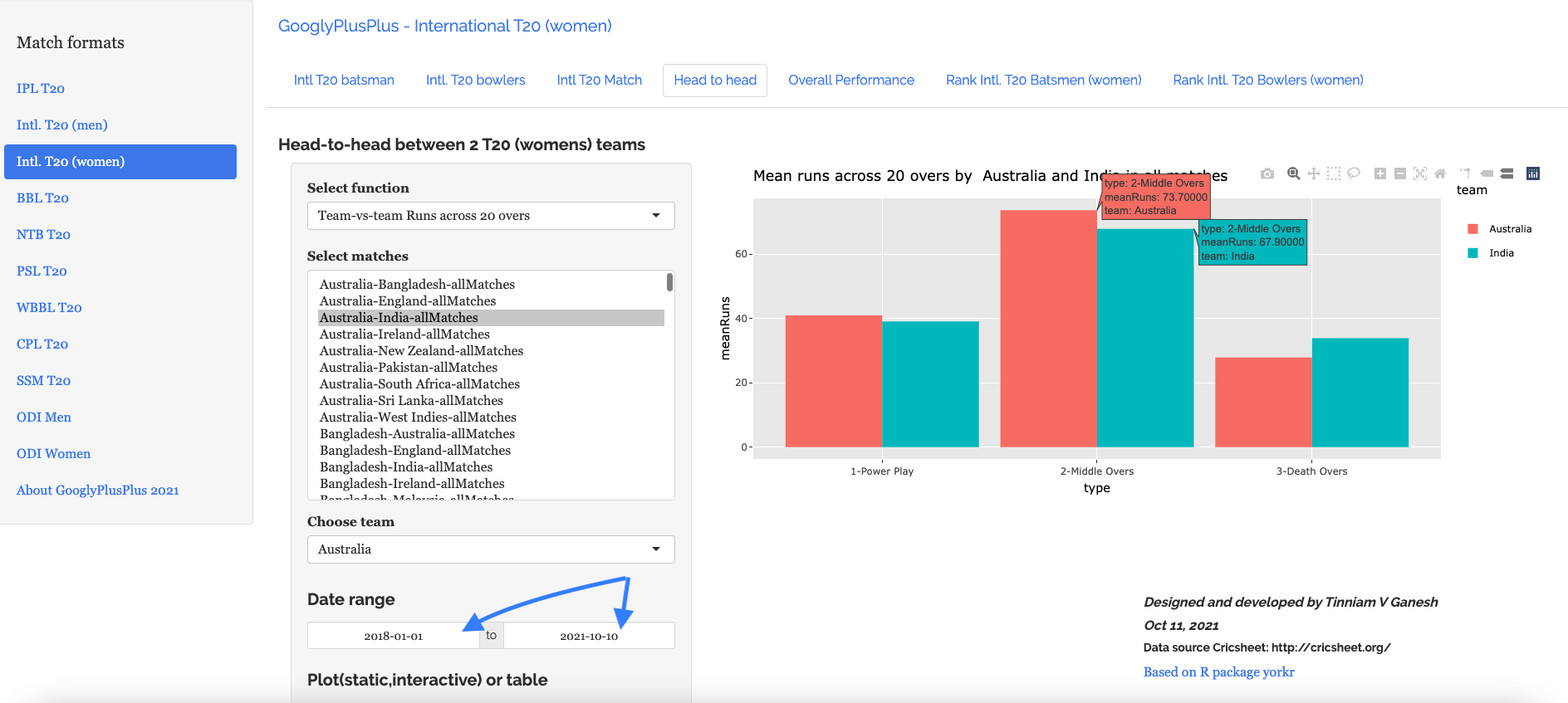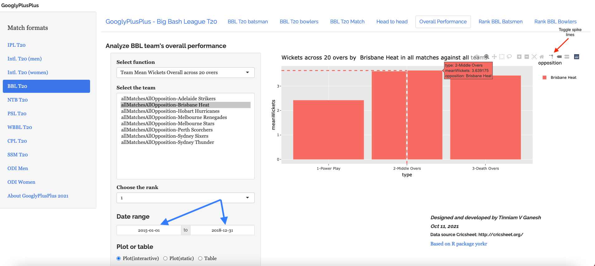 You can now perform drill-down analytics for batsmen, bowlers, head-to-head and overall performance based on date-range selector functionality. The ranking tabs also include date range selector granular analysis. For more details see GooglyPlusPlus2021 enhanced with drill-down batsman, bowler analytics