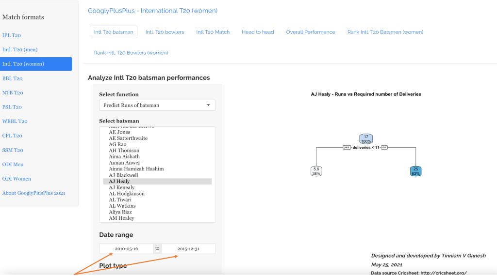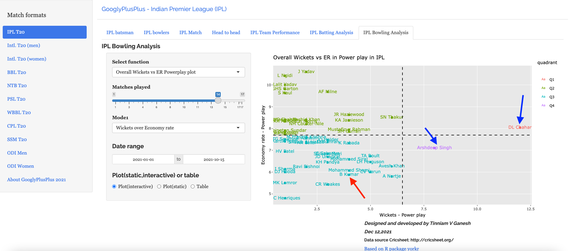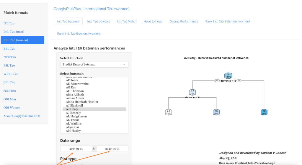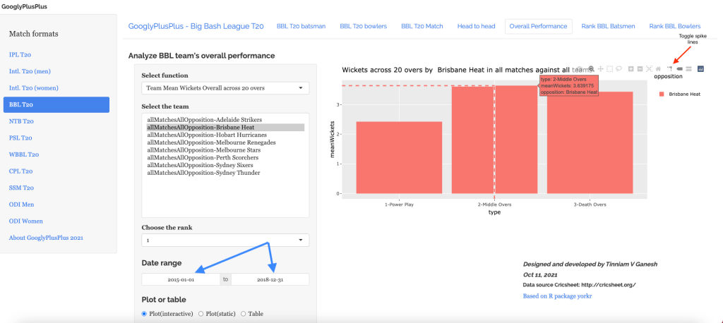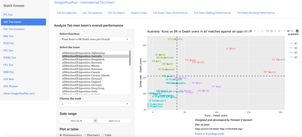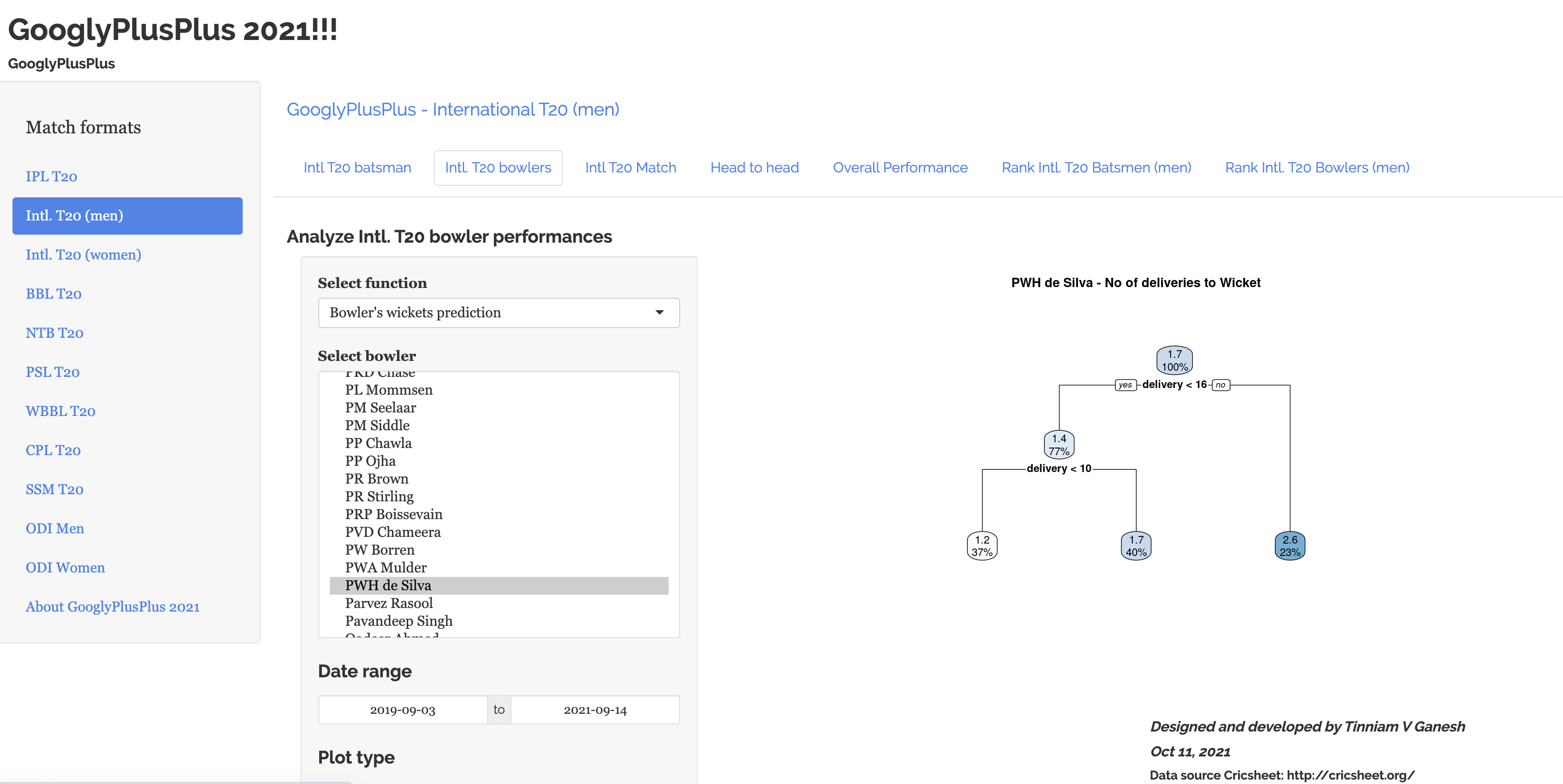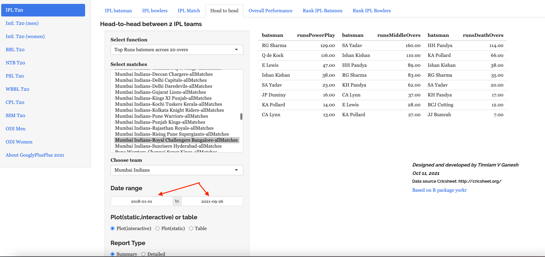 You can now perform drill-down analytics for batsmen, bowlers, head-to-head and overall performance based on date-range selector functionality. The ranking tabs also include date range selector granular analysis. For more details see GooglyPlusPlus2021 enhanced with drill-down batsman, bowler analytics