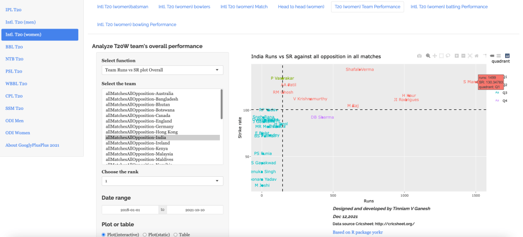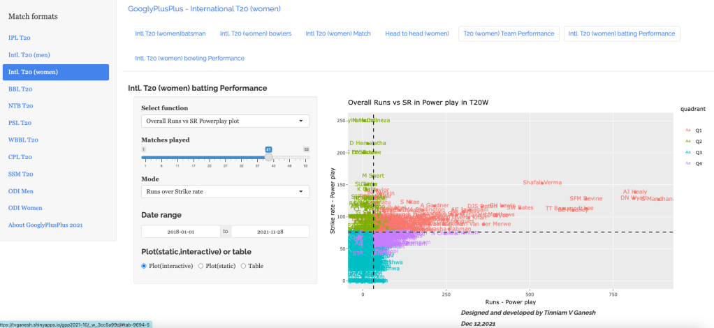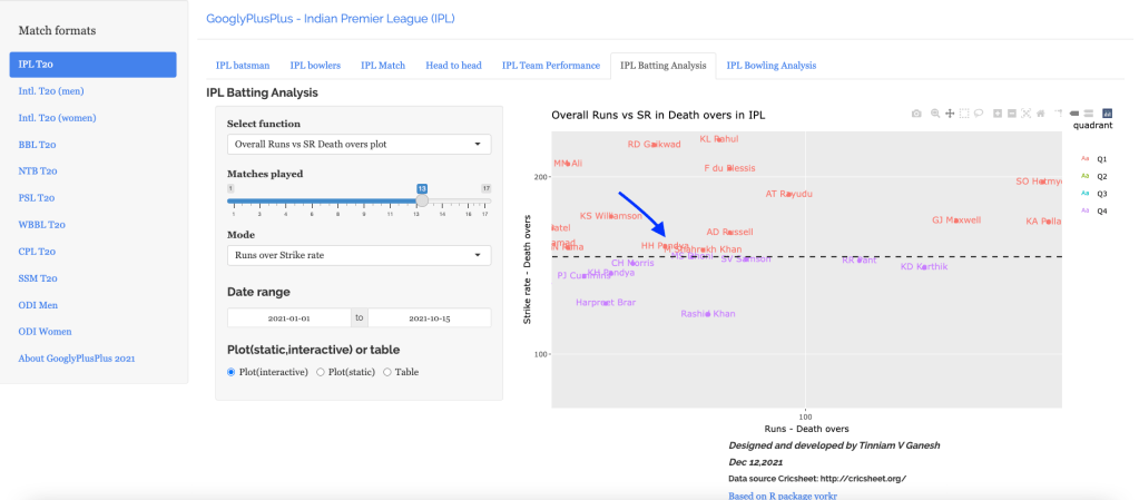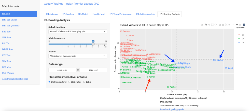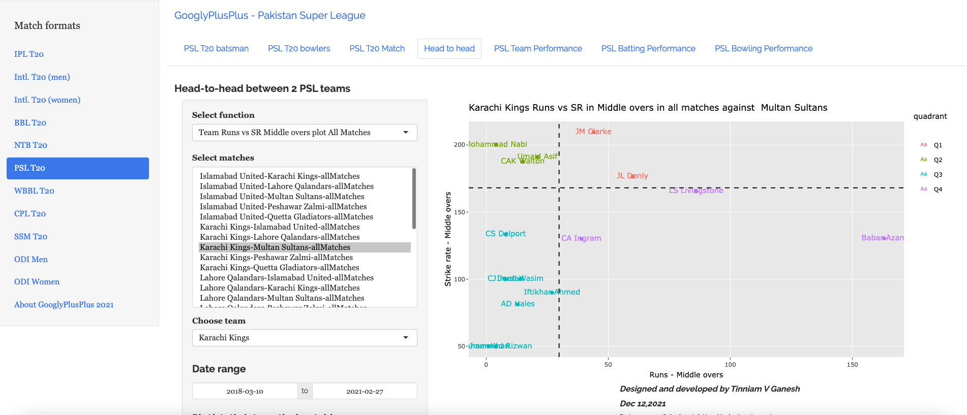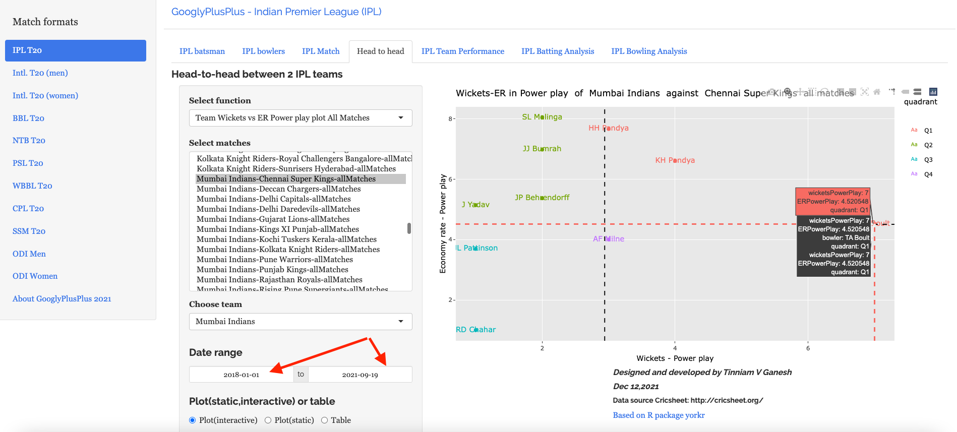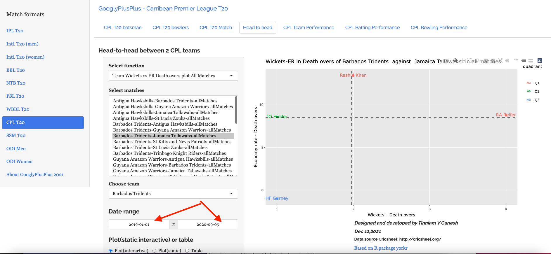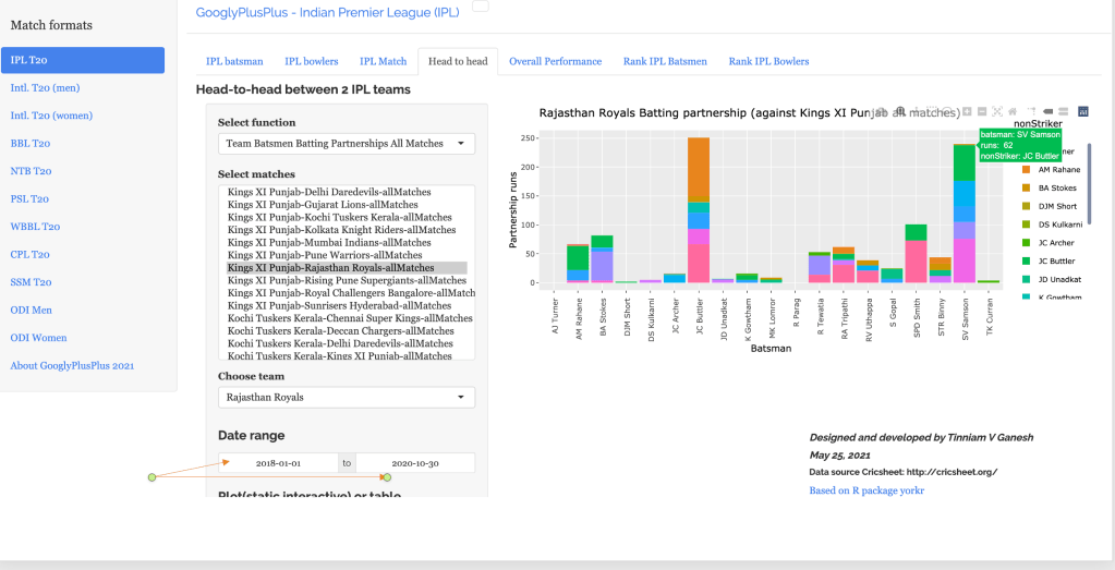 You can now perform drill-down analytics for batsmen, bowlers, head-to-head and overall performance based on date-range selector functionality. The ranking tabs also include date range selector granular analysis. For more details see GooglyPlusPlus2021 enhanced with drill-down batsman, bowler analytics