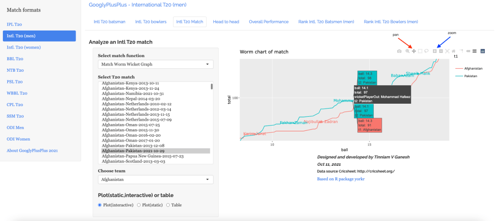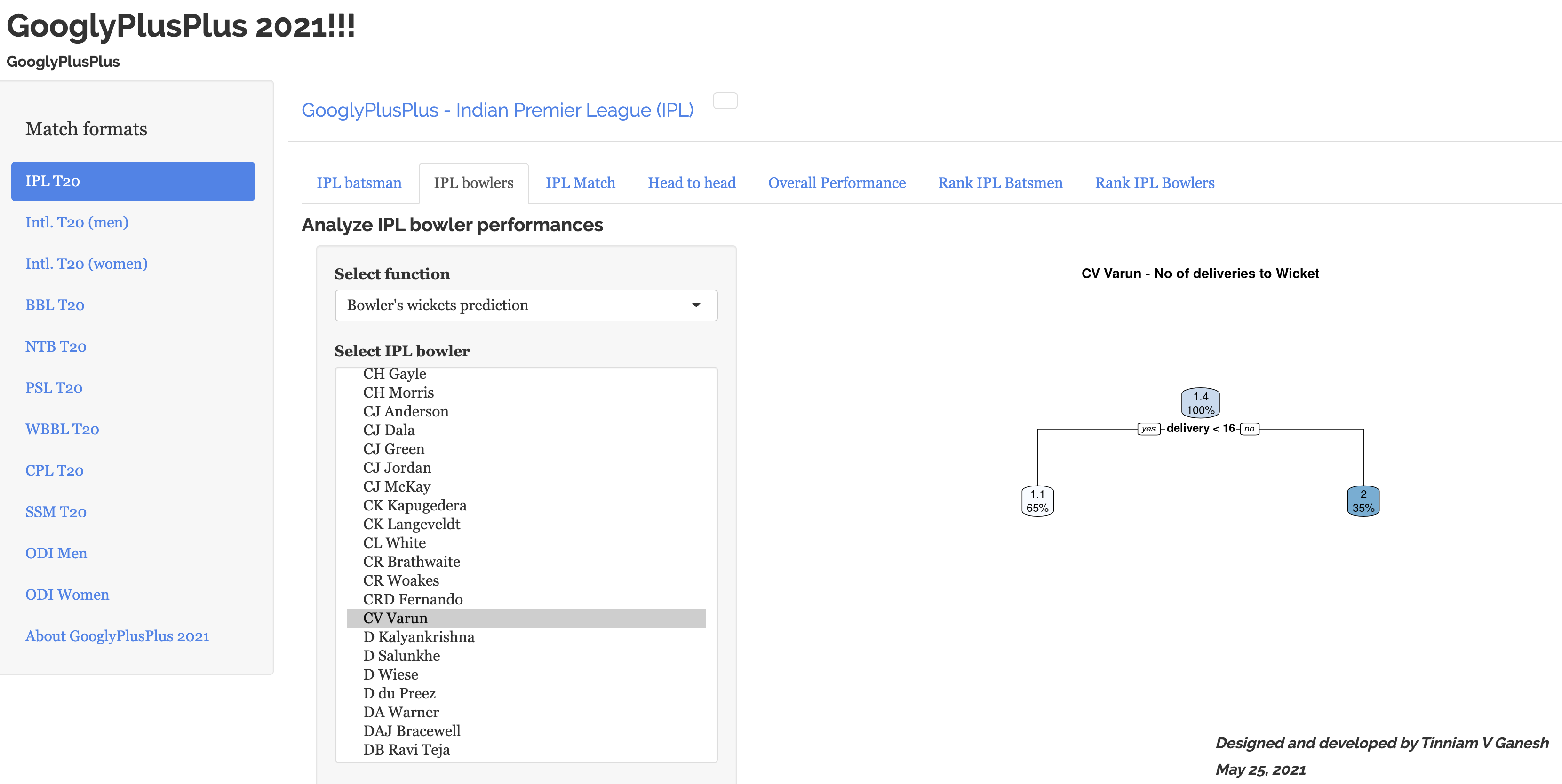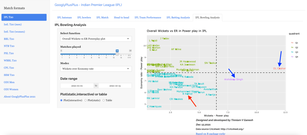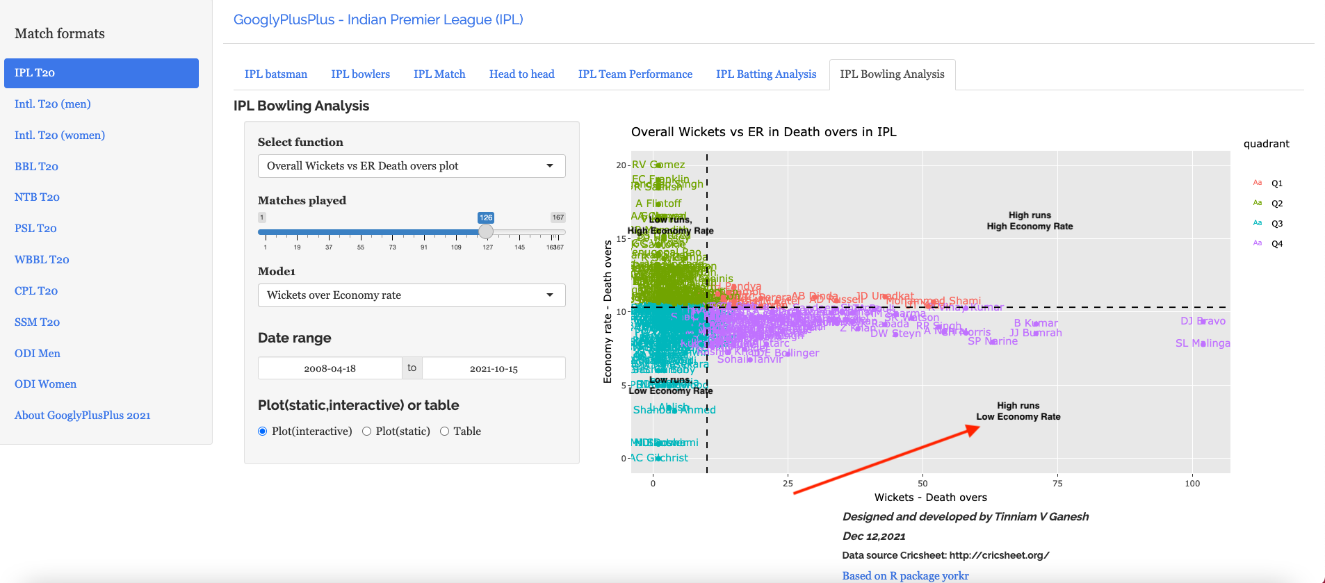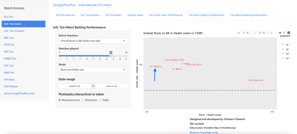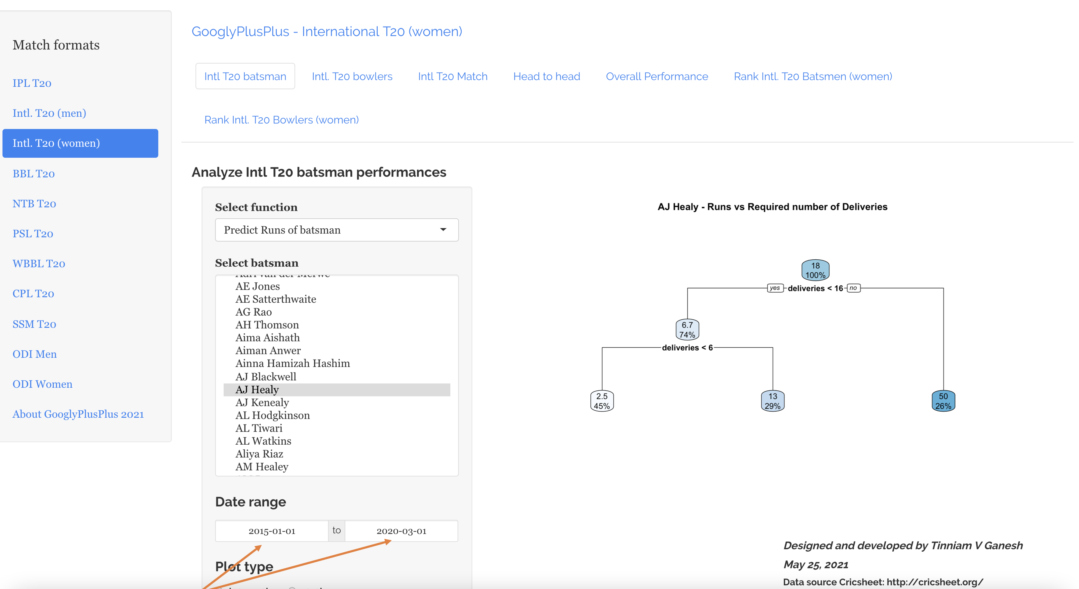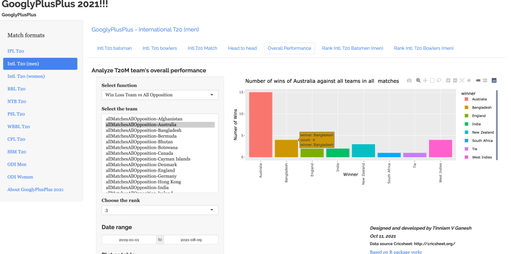 You can now perform drill-down analytics for batsmen, bowlers, head-to-head and overall performance based on date-range selector functionality. The ranking tabs also include date range selector granular analysis. For more details see GooglyPlusPlus2021 enhanced with drill-down batsman, bowler analytics