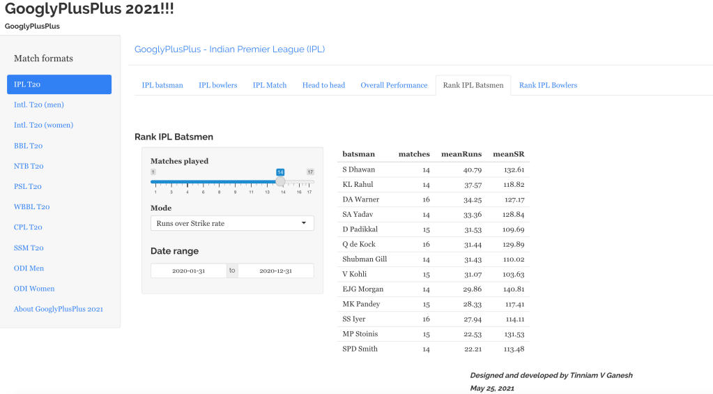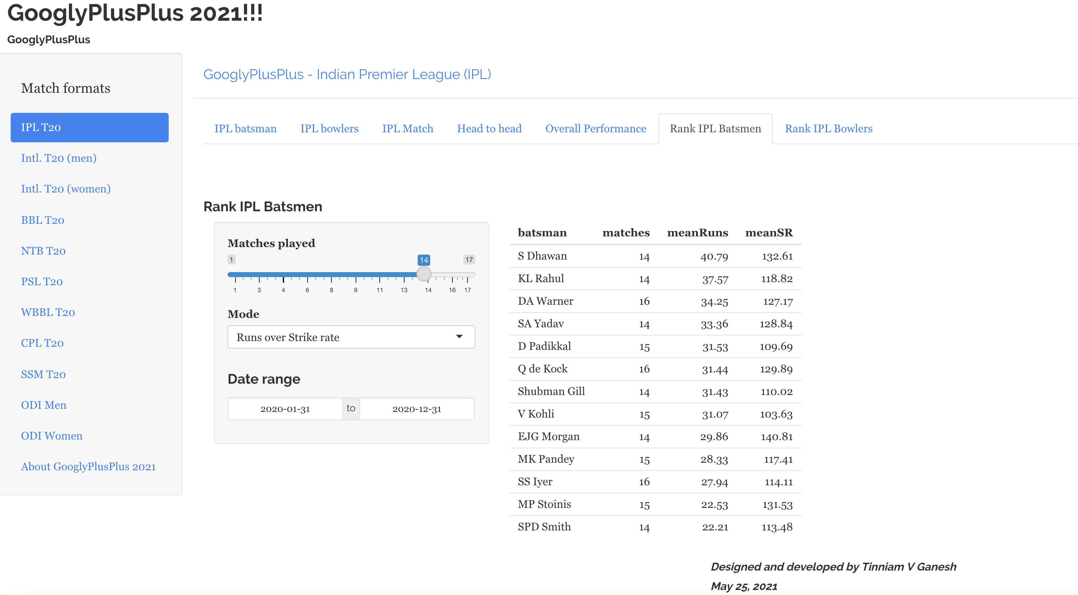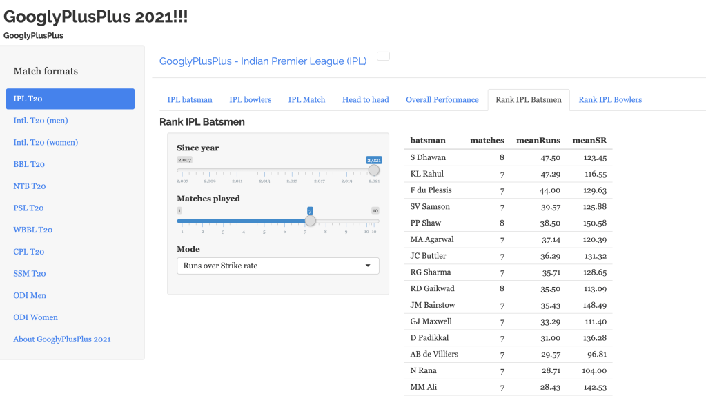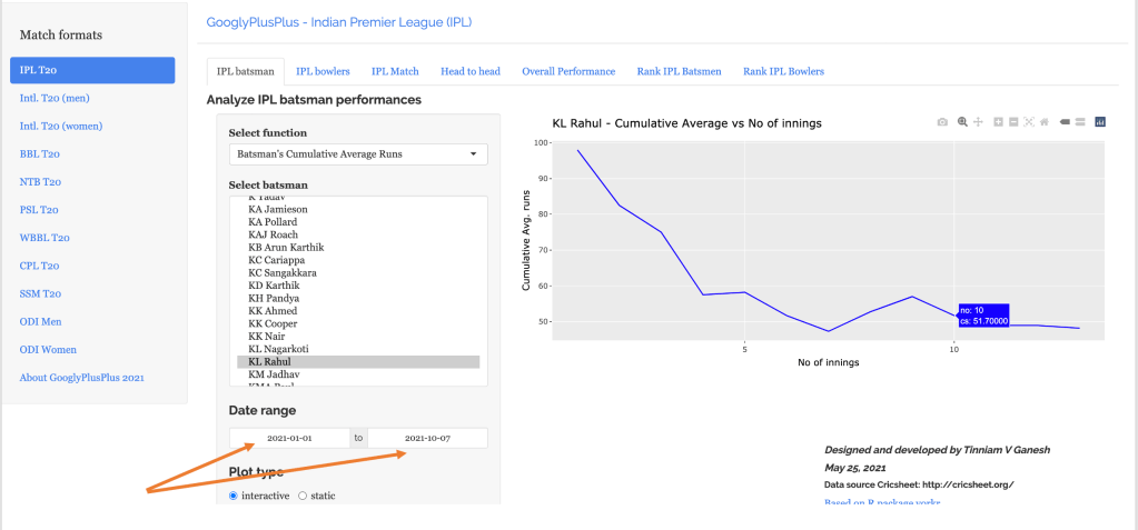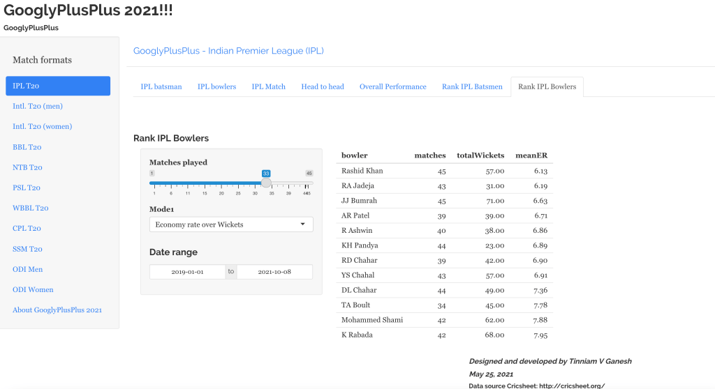 b) The ‘Rank Batsman’ and ‘Rank Bowler’ tabs also include a date range selector, against the earlier version which had a ‘Since year’ slider see GooglyPlusPlus2021 bubbles up top T20 players in all formats!. The earlier ‘Since year’ slider option could only rank for the latest year or for all years up to the current year. Now with the new ‘date range’ picker we can check the batsman and bowler ranks in any IPL season or (any T20 format) or for a range of years.