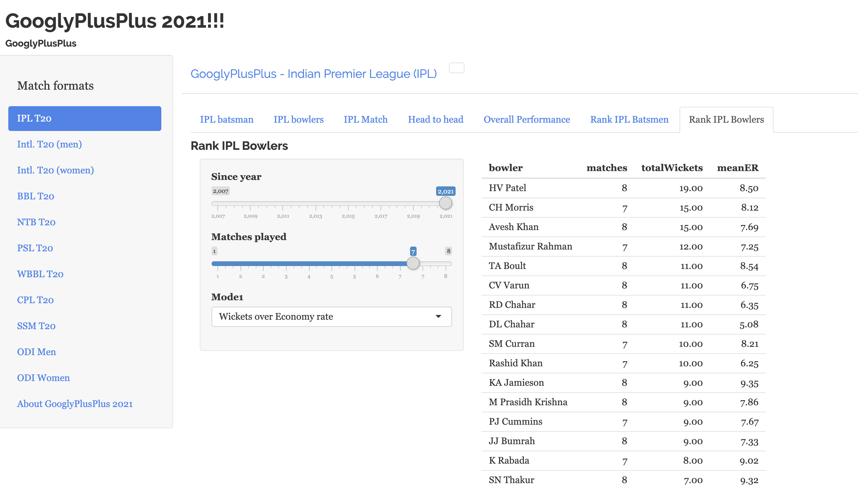 Go ahead take GooglyPlusPlus2021 for a test drive and check out how your favourite players perform in power play, middle and death overs. Click GooglyPlusPlus2021