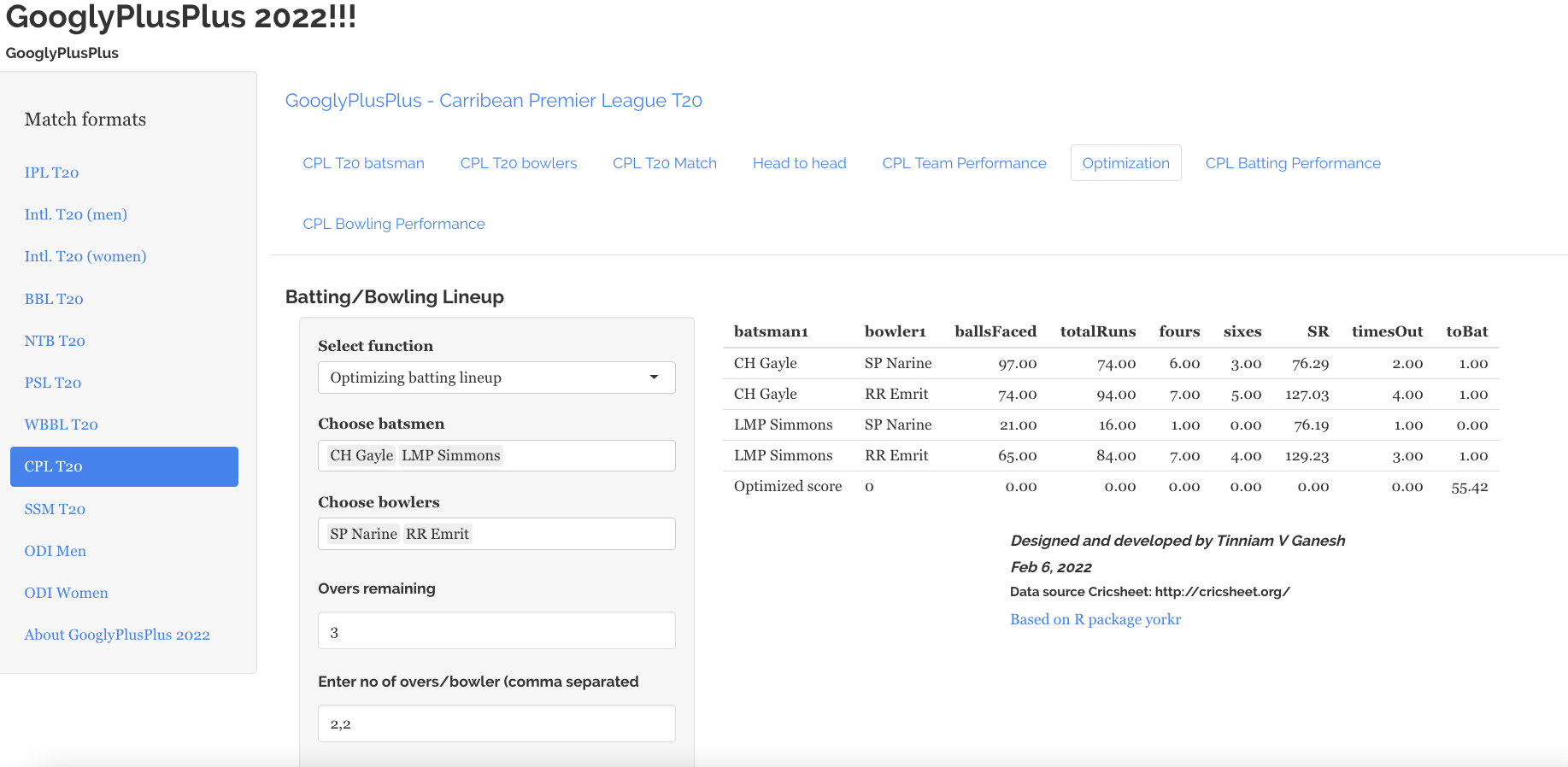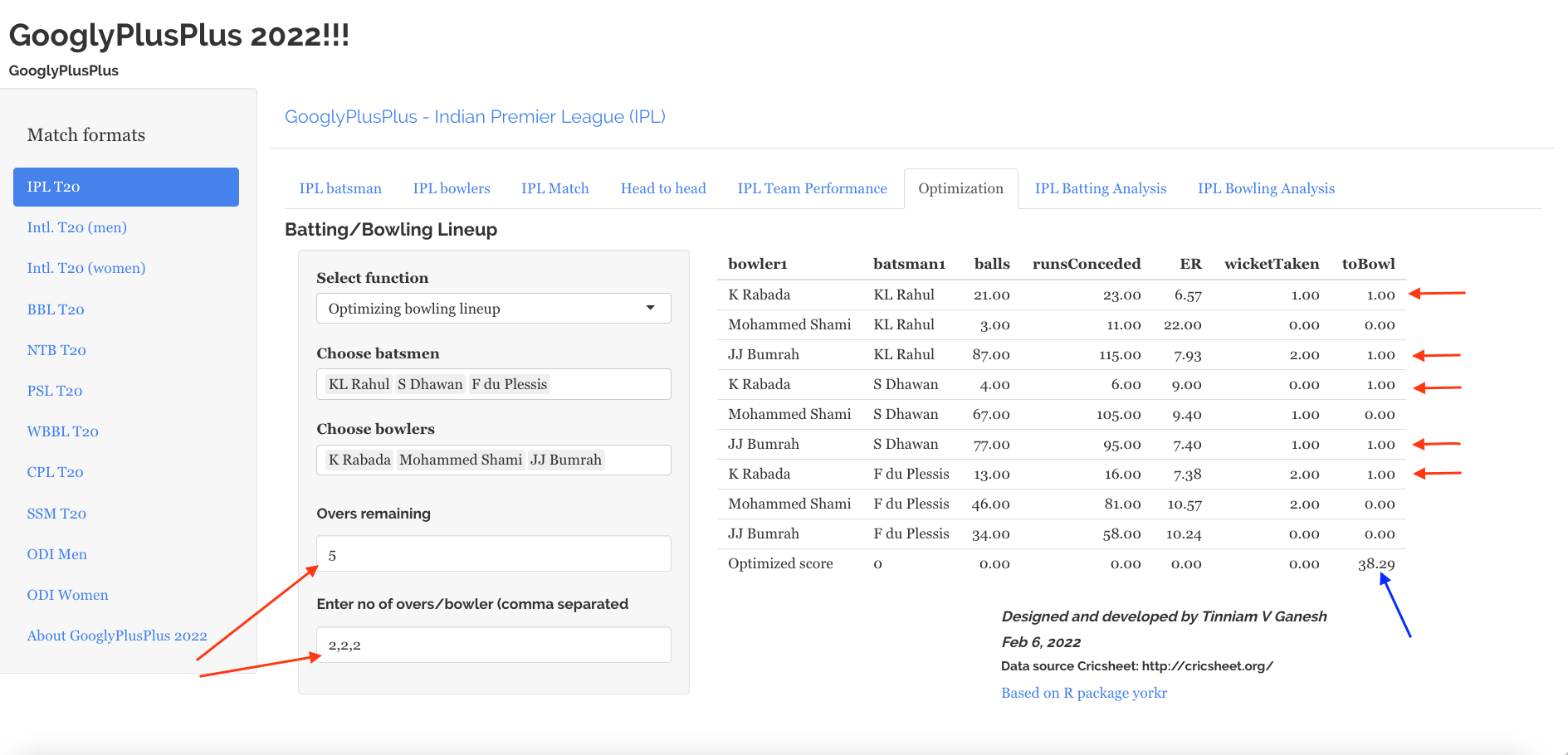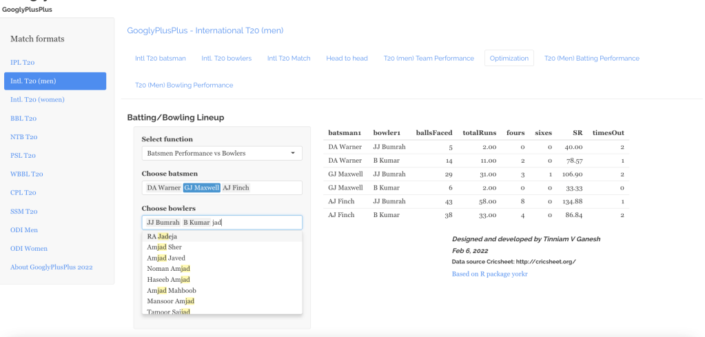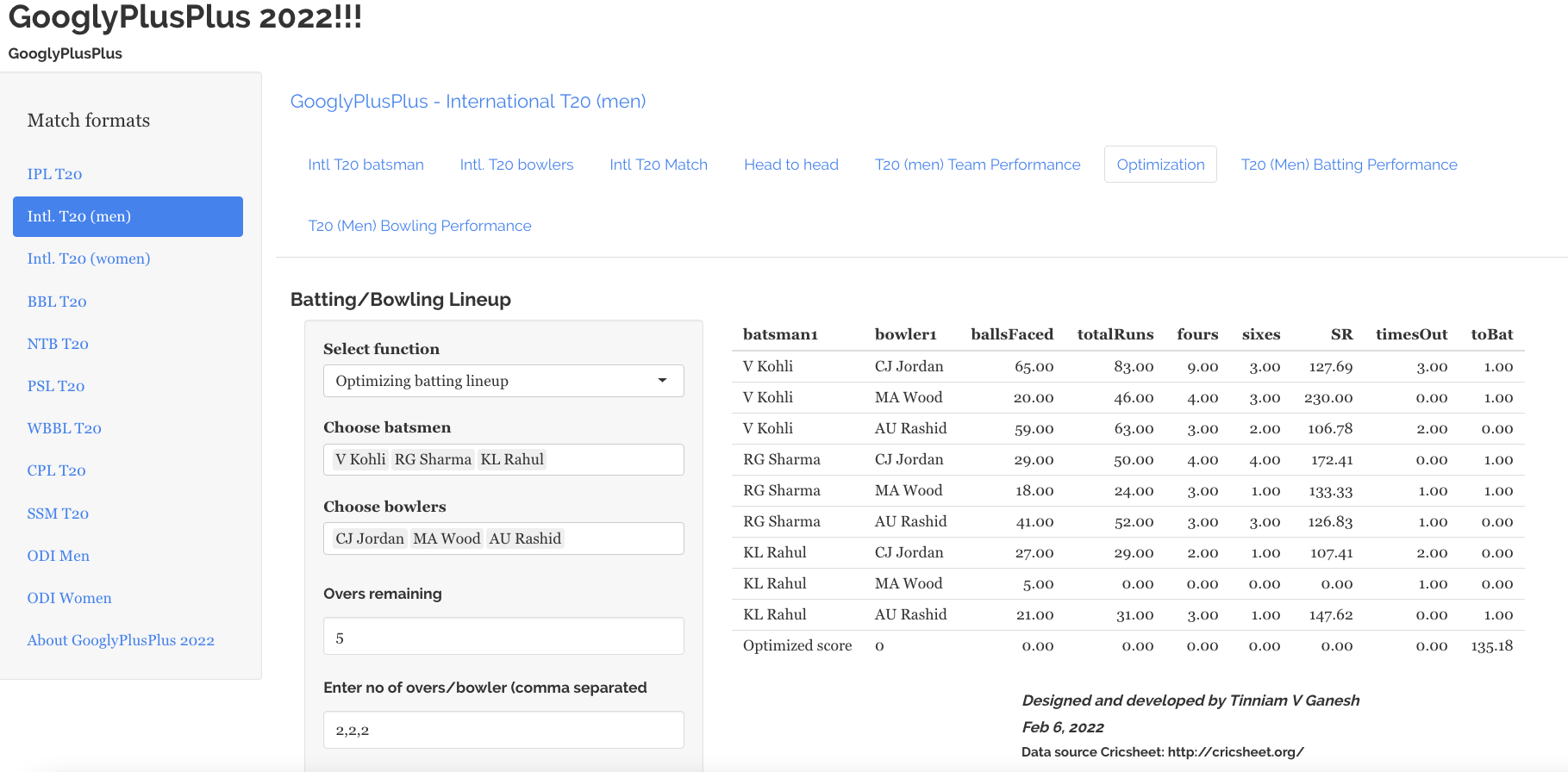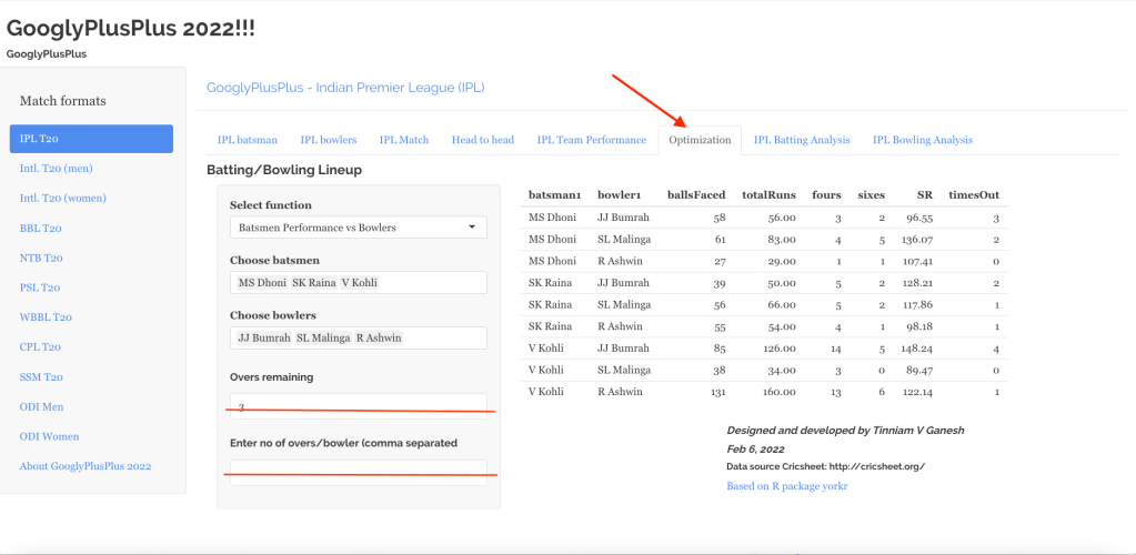 Optimisation tab: Allows one to pit batsmen vs bowlers and vice-versa. This tab also uses integer programming to optimise batting and bowling lineup