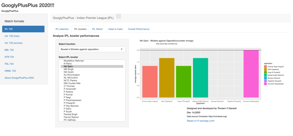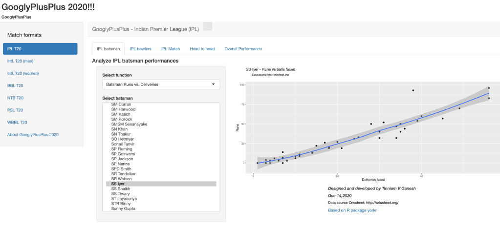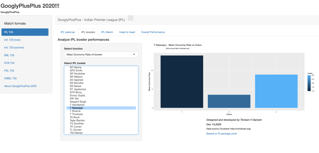I have updated my GooglyPlusPlus Shiny app with data from latest IPL 2020. GooglyPlusPlus 2020 is also based on my R package yorkr. To know more about yorkr (see Revitalizing R package yorkr.) Now you should be able to analyze IPL matches, teams, players upto IPL 2020. Note: My latest GooglyPlusPlus 2020 can analyze all formats of T20 matches. yorkr uses data from Cricsheet