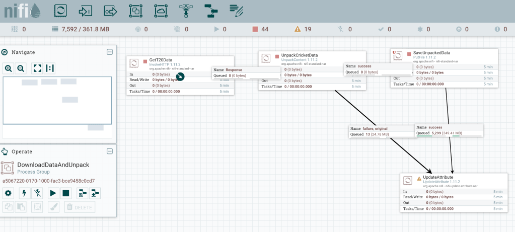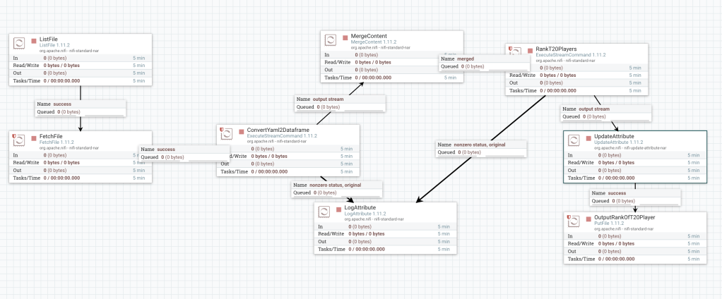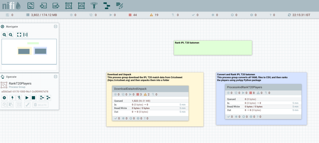 The overall NiFi flow contains 2 Process Groups a) DownloadAnd Unpack. b) Convert and Rank IPL batsmen. While it appears that the Process Groups are disconnected, they are not. The first process group downloads the T20 zip file, unpacks the. zip file and saves the YAML files in a specific folder. The second process group monitors this folder and starts processing as soon the YAML files are available. It processes the YAML converting it into dataframes before storing it as CSV file. The next processor then does the actual ranking of the batsmen before writing the output into IPLrank.txt