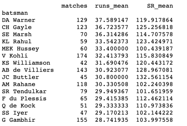 [1] "Chennai Super Kings" [1] "Deccan Chargers" [1] "Delhi Daredevils" [1] "Kings XI Punjab" [1] "Kochi Tuskers Kerala" [1] "Kolkata Knight Riders" [1] "Mumbai Indians" [1] "Pune Warriors" [1] "Rajasthan Royals" [1] "Royal Challengers Bangalore" [1] "Sunrisers Hyderabad" [1] "Gujarat Lions" [1] "Rising Pune Supergiants" [1] "Chennai Super Kings-BattingDetails.RData" [1] "Deccan Chargers-BattingDetails.RData" [1] "Delhi Daredevils-BattingDetails.RData" [1] "Kings XI Punjab-BattingDetails.RData" [1] "Kochi Tuskers Kerala-BattingDetails.RData" [1] "Kolkata Knight Riders-BattingDetails.RData" [1] "Mumbai Indians-BattingDetails.RData" [1] "Pune Warriors-BattingDetails.RData" [1] "Rajasthan Royals-BattingDetails.RData" [1] "Royal Challengers Bangalore-BattingDetails.RData" [1] "Sunrisers Hyderabad-BattingDetails.RData" [1] "Gujarat Lions-BattingDetails.RData" [1] "Rising Pune Supergiants-BattingDetails.RData" # A tibble: 429 x 4 batsman matches meanRuns meanSR <chr> <int> <dbl> <dbl> 1 DA Warner 130 37.9 128. 2 LMP Simmons 29 37.2 106. 3 CH Gayle 125 36.2 134. 4 HM Amla 16 36.1 108. 5 ML Hayden 30 35.9 129. 6 SE Marsh 67 35.9 120. 7 RR Pant 39 35.3 135. 8 MEK Hussey 59 33.8 105. 9 KL Rahul 59 33.5 128. 10 MN van Wyk 5 33.4 112. # … with 419 more rows