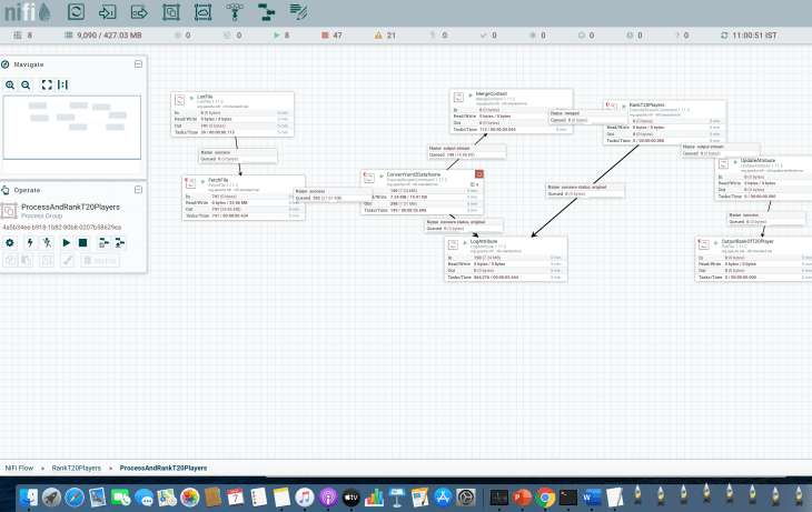 In this post, I construct an end-to-end Apache NiFi pipeline with my R package yorkr. This post is a mirror of my earlier post Big Data-5: kNiFing through cricket data with yorkpy based on my Python package yorkpy. The Apache NiFi Data Pipeilne flows all the way from the source, where the data is obtained, all the way to target analytics output. Apache NiFi was created to automate the flow of data between systems. NiFi dataflows enable the automated and managed flow of information between systems. This post automates the flow of data from Cricsheet, from where the zip file it is downloaded, unpacked, processed, transformed and finally T20 players are ranked.