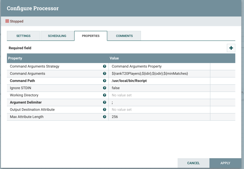 This processor is an ExecuteStreamCommand Processor that executes a Rscript which invokes a yorrkr function rankIPLT20Batsmen()