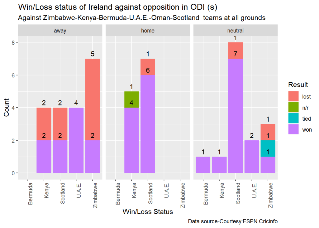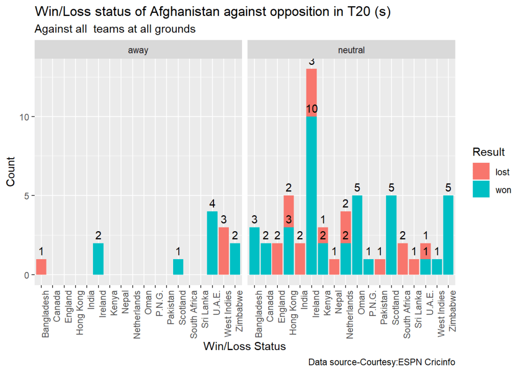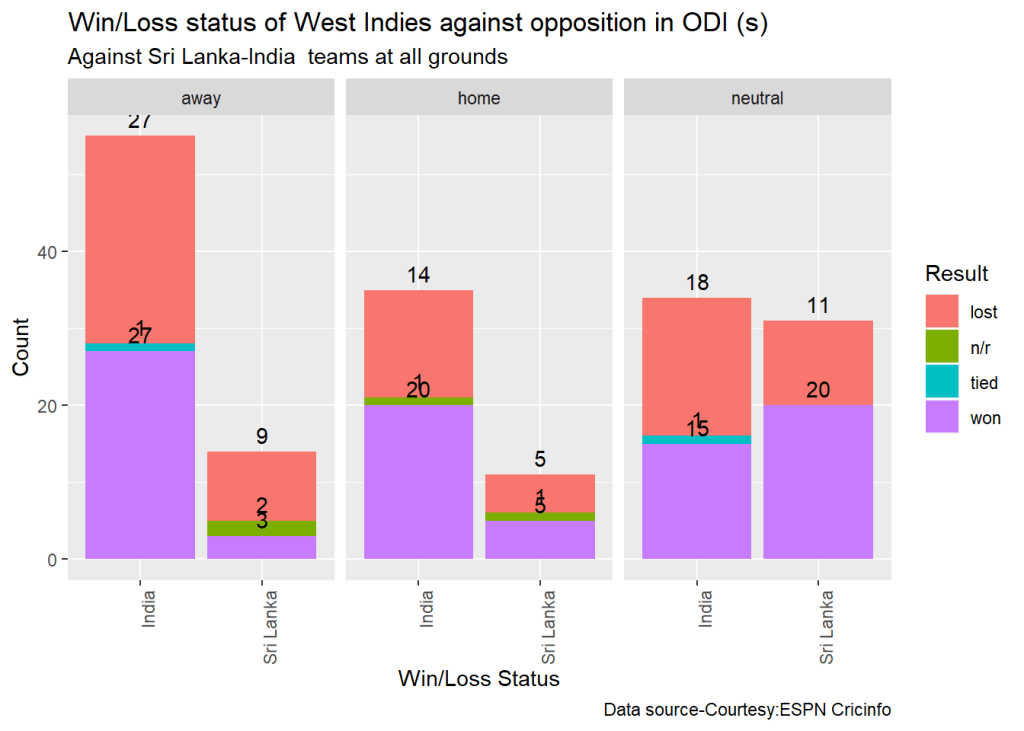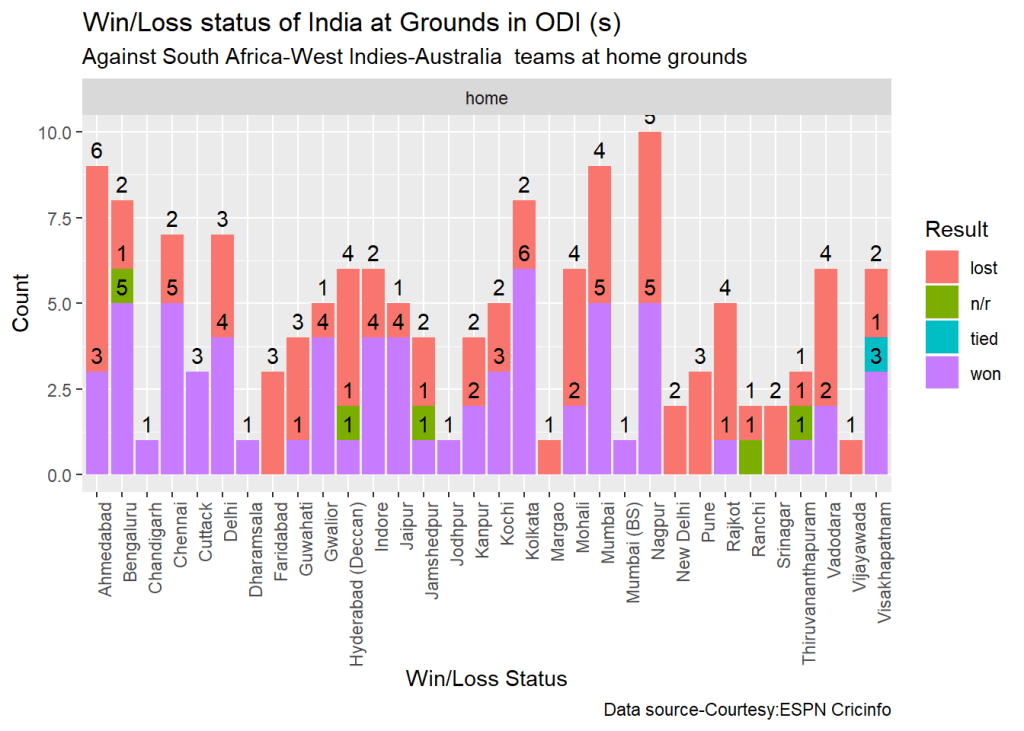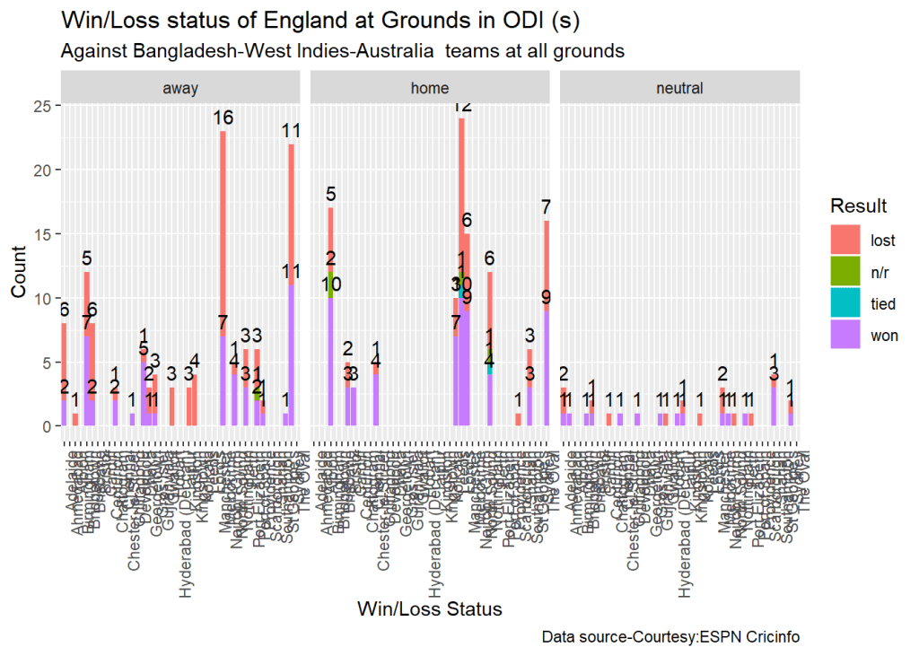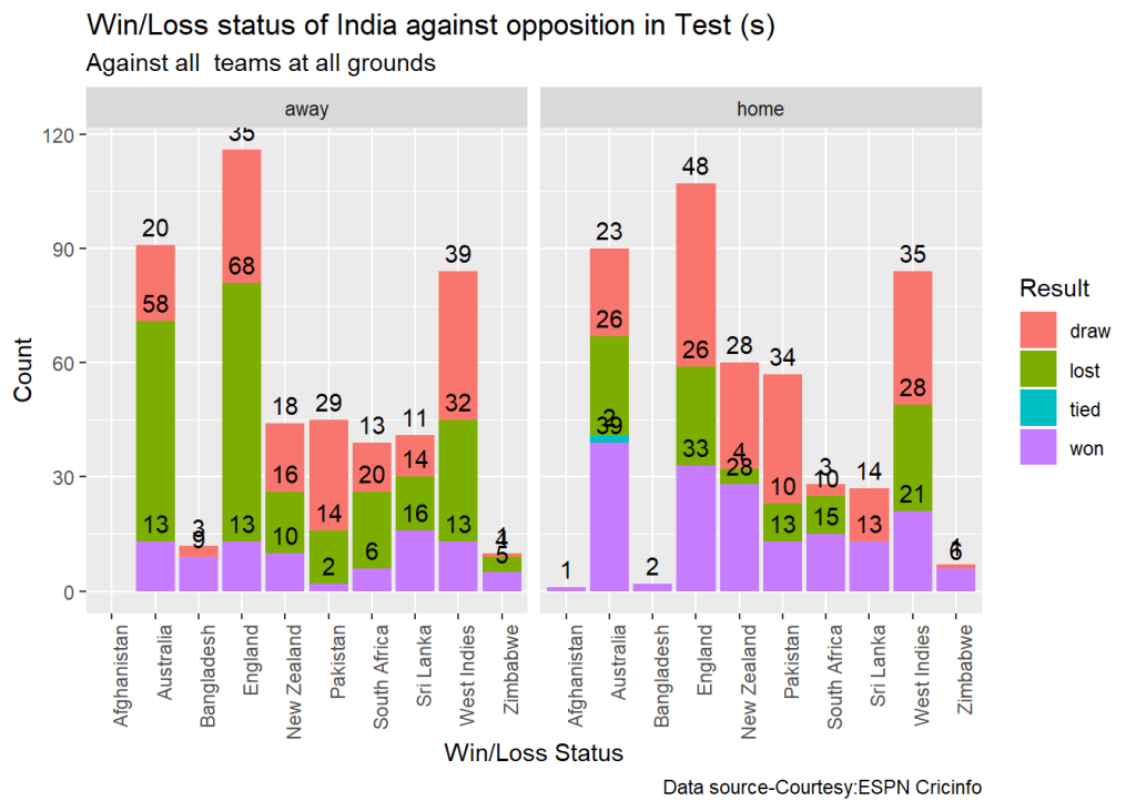teamWinLossStatusAtGrounds("indiaTest.csv",teamName="India",opposition=c("all"),homeOrAway=c("away"),matchType="Test",plot=TRUE)