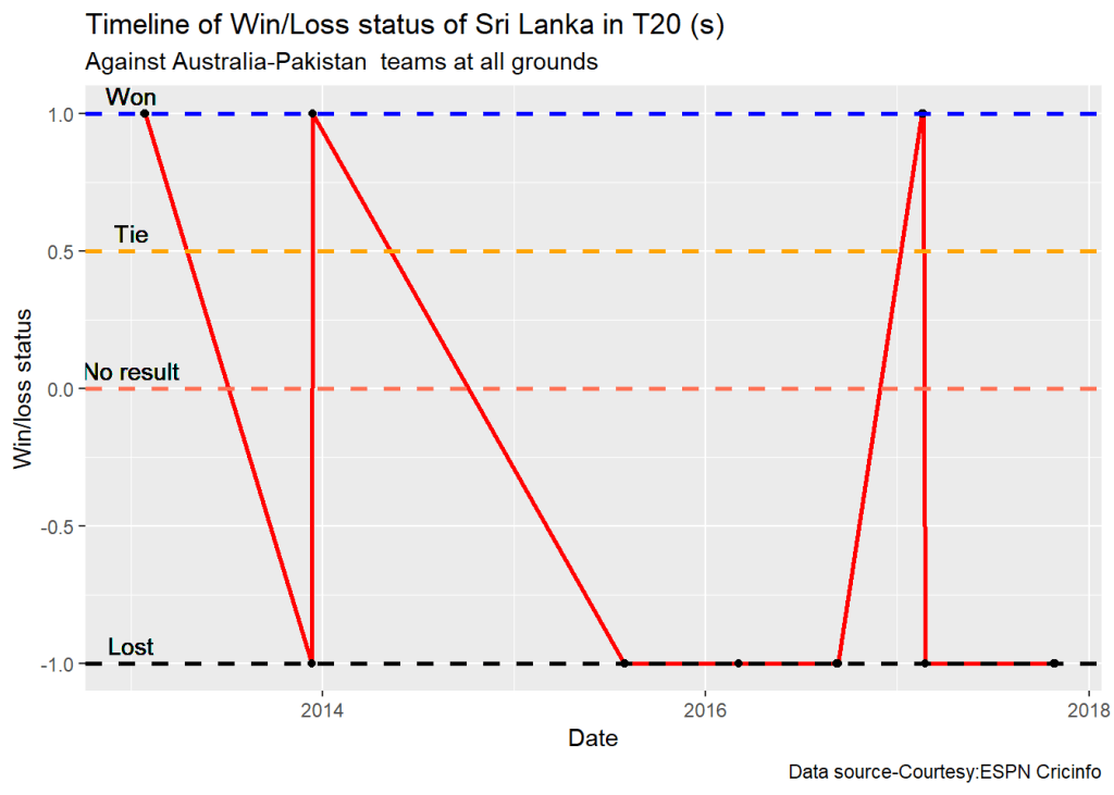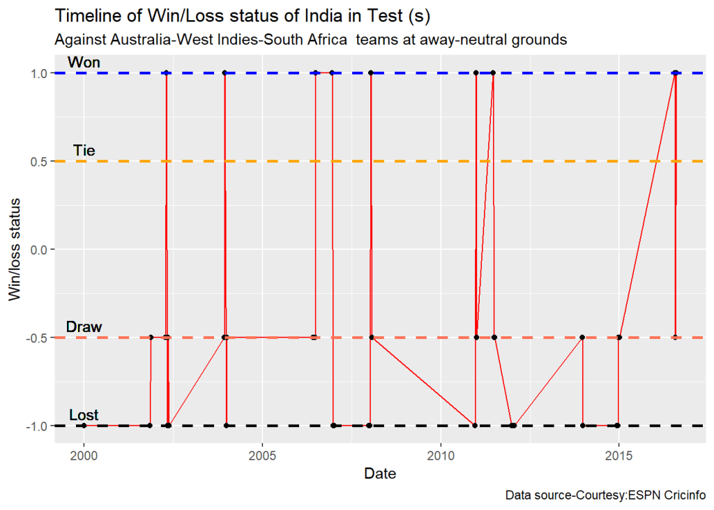 plotTimelineofWinsLosses("indiaTest.csv",team="India",opposition=c("Australia"),