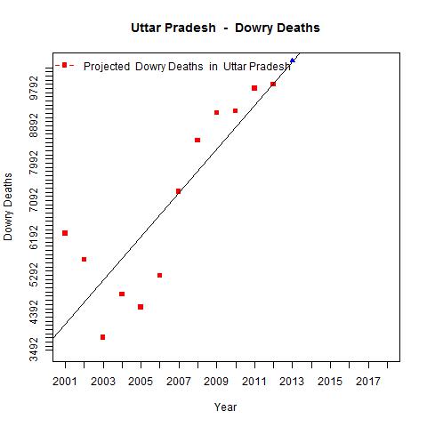 The data in OGD is available for crimes against women in different states under different ‘crime heads’ like rape, dowry deaths, kidnapping & abduction etc. The data is available for years from 2001 to 2012. This data is plotted as a scatter plot and a linear regression line is then fit on the available data. Based on this linear model, the projected incidence of crimes likes rapes, dowry deaths, abduction & kidnapping is performed for each of the states. This is then used to build a table of different crime heads for all the states predicting the number of crimes till the year 2018. Fortunately, R crunches through the data sets quite easily. The overall projections of crimes against as women is shown below based on the linear regression for each of these states