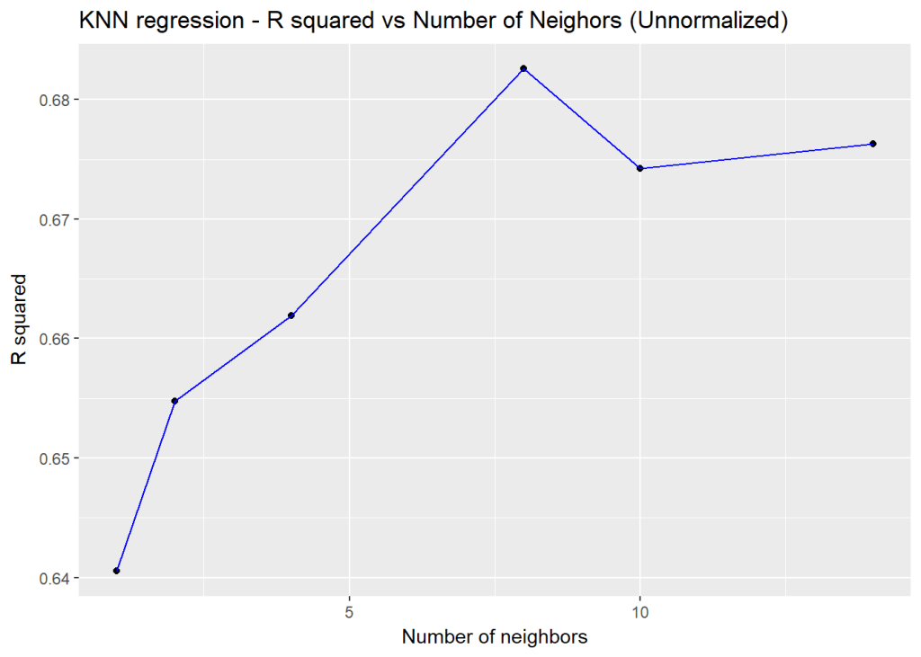 df2<-df1%>%select(cylinder,displacement, horsepower,weight, acceleration, year,mpg)df3<-df2[complete.cases(df2),]# Perform MinMaxScaling of feature variables train.X.scaled=MinMaxScaler(train.X)test.X.scaled=MinMaxScaler(test.X)# Create a list of neighborsrsquared<-NULLneighbors<-c(1,2,4,6,8,10,12,15,20,25,30)for(iinseq_along(neighbors)){# Fit a KNN modelknn=knn.reg(train.X.scaled,test.X.scaled,train.Y,k=i)# Compute R ssquaredrsquared[i]=knnRSquared(knn$pred,test.Y)}df<-data.frame(neighbors,Rsquared=rsquared)# Plot the number of neighors vs the R squared ggplot(df,aes(x=neighbors,y=Rsquared))+geom_point()+geom_line(color="blue")+xlab("Number of neighbors")+ylab("R squared")+ggtitle("KNN regression - R squared vs Number of Neighors(Normalized)")