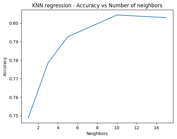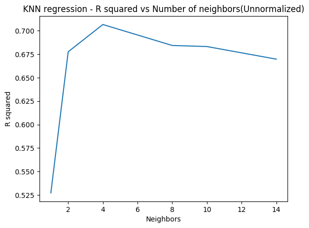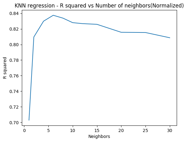 fig4=plt.title("KNN regression - R squared vs Number of neighbors(Normalized)")