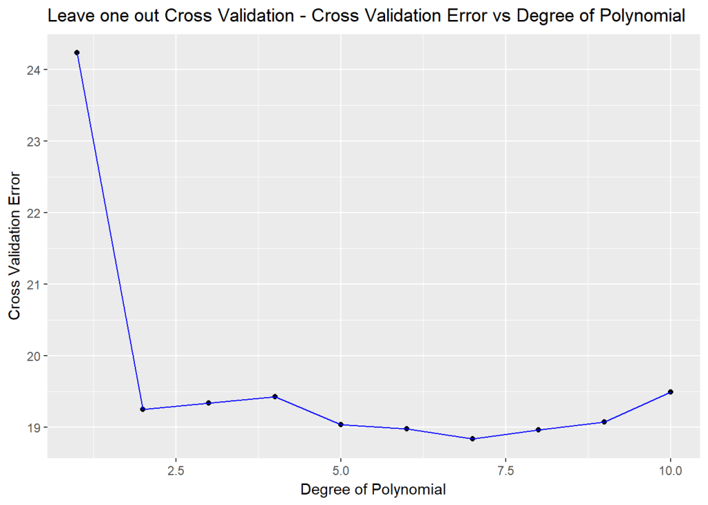 Here a smoothing spline is used. Smoothing splines also do not require the explicit setting of knots. We can change the ‘degrees of freedom(df)’ paramater to get the best fit