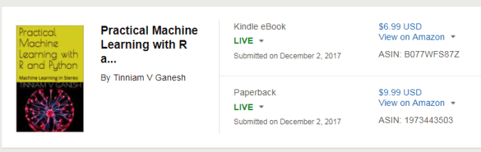 Check out my compact and minimal book “Practical Machine Learning with R and Python:Third edition- Machine Learning in stereo” available in Amazon in paperback($12.99) and kindle($8.99) versions. My book includes implementations of key ML algorithms and associated measures and metrics. The book is ideal for anybody who is familiar with the concepts and would like a quick reference to the different ML algorithms that can be applied to problems and how to select the best model. Pick your copy today!!
