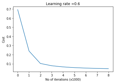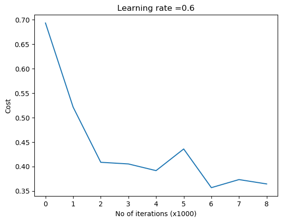 parameters = L_Layer_DeepModel(train_X, train_Y, layersDimensions, hiddenActivationFunc='relu', outputActivationFunc="sigmoid",learningRate = 0.6, num_iterations = 9000, initType="default", print_cost = True,figure="fig1.png")