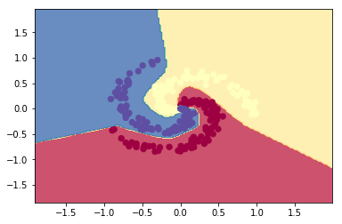 plotDecisionBoundary(z,retvals,keep_prob=0.6, hiddenActivationFunc="relu",0.5)