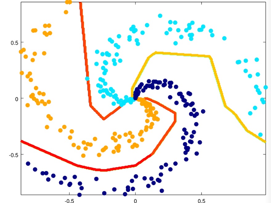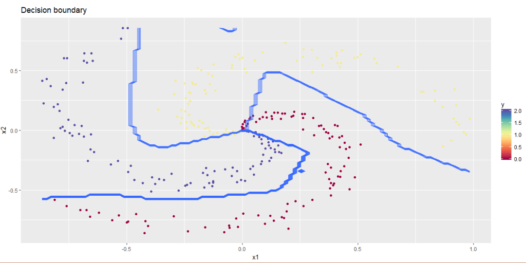 plotDecisionBoundary(z,retvals,hiddenActivationFunc="relu",lr=0.5)