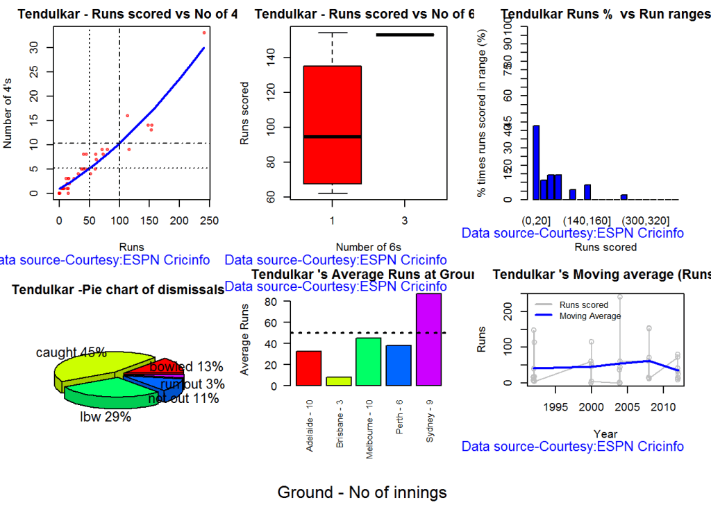 This package uses the statistics info available in ESPN Cricinfo Statsguru. The current version of this package can handle all formats of the game including Test, ODI and Twenty20 cricket for players (batsmen & bowlers) and also teams (Test, ODI and T20)