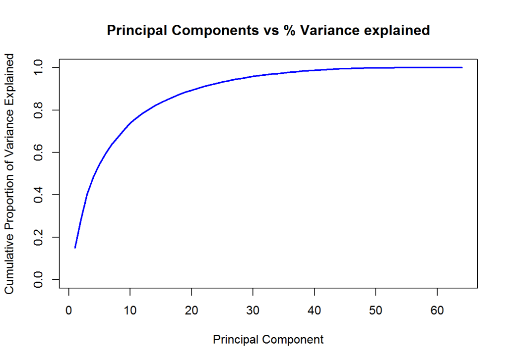 In the code below the variance explained vs the number of principal components is plotted. It can be seen that with 20 Principal components almost 90% of the variance is explained by this reduced dimensional model.