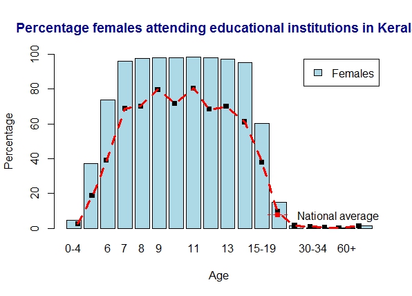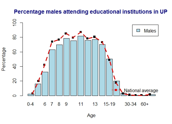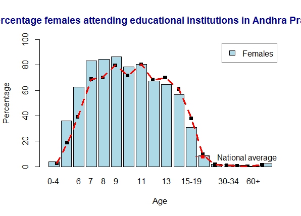 This is then plotted as a bar chart with the age distribution. I then overlay the national average for each state over the barchart to check whether the literacy in the state is above or below the national average. The implementation in R is included below