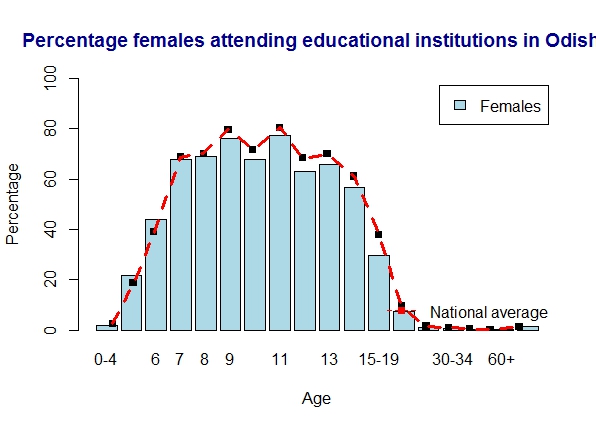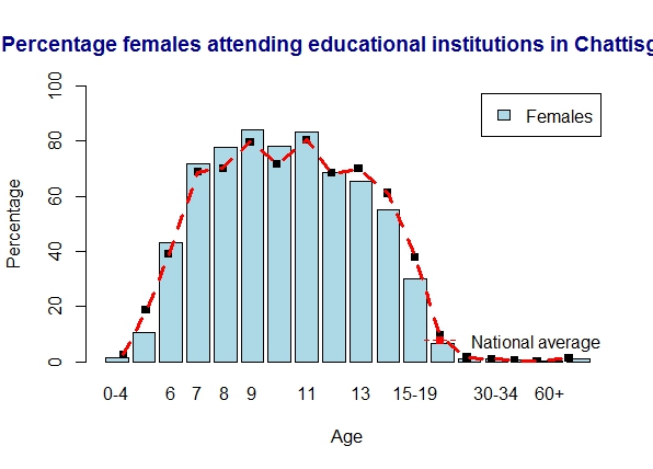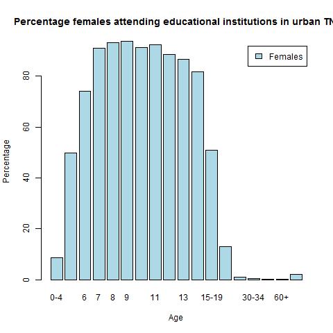 barplot(arunachalpercentF,names.arg=arunachalmat[1,],main ="Percentage females attending educational institutions in Arunachal Pradesh ",