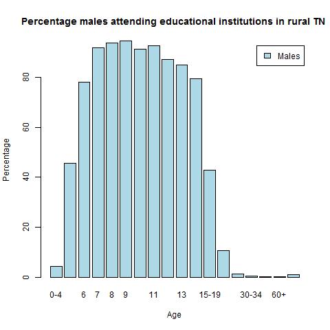 barplot(arunachalpercentM,names.arg=arunachalmat[1,],main ="Percentage males attending educational institutions in Arunachal Pradesh",